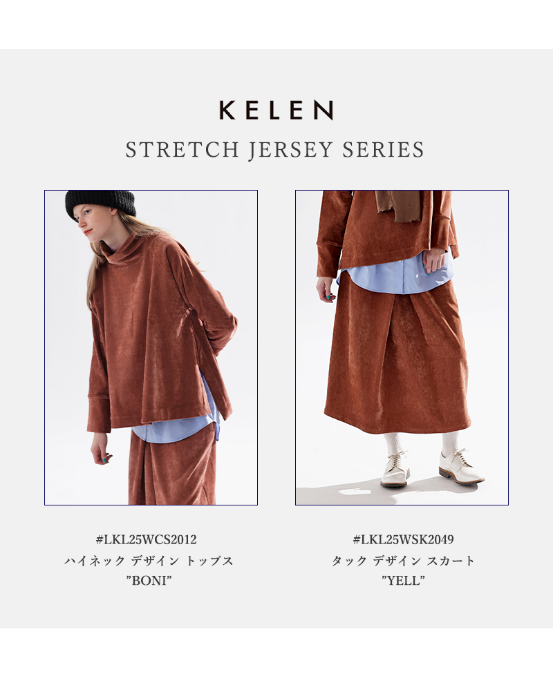 kelen(ケレン)よりストレッチ ジャージー ハイネック デザイン トップス “BONI” をご紹介します。 両面起毛の柔らかく肌触りの良いベロア調の上品な光沢感のあるオフタートルカットソー。 ストレッチのある、滑りの良い厚手のポリエステルジャージー素材で、ウールの苦手な方にもぜひオススメです。 厚みのあるオフタートルネックは首元をスッポリと優しくカバーしてくれます。 台形型の身頃にはフレア展開で動きを加え、サイドに入ったスリットが抜け感をプラスしてくれます。 ラグランスリーブでリラックス感もありつつ、長めにとった袖口パーツでメリハリのあるシルエットが完成しました。 共通素材のタックデザインスカート(LKL25WSK2049)とのセットアップスタイリングもオススメです。