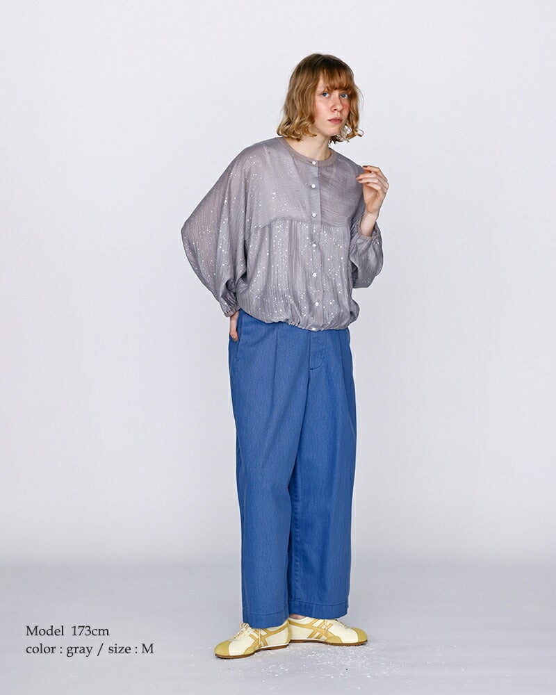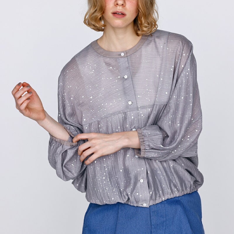 kelen(ケレン)より箔プリント バルーンシルエット ブラウス “SNOW”のご紹介です。シアー素材をベースに、繊細なきらめきを放つ箔プリントを散りばめた、存在感のあるデザイントップス。華やかさがありながらも、落ち着いたトーンでまとめることで大人らしい印象に仕上げています。たっぷりとしたドルマンスリーブに、袖口と裾へゴムを施し、ふんわりと丸みのあるバルーンシルエットを演出。リラックス感のある着心地と、自然な立体感を両立しました。シワになりにくく、程よい透け感のある素材は、暑い季節にも快適。タンクトップやTシャツに重ねるだけで、上品なレイヤードスタイルが完成します。空調対策としてワンピースの上に羽織るなど、デイリーからきれいめまで幅広く活躍する一枚です。