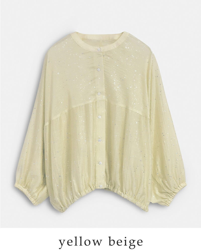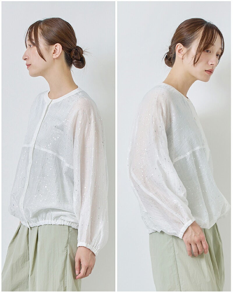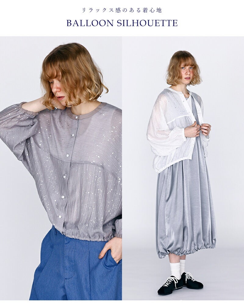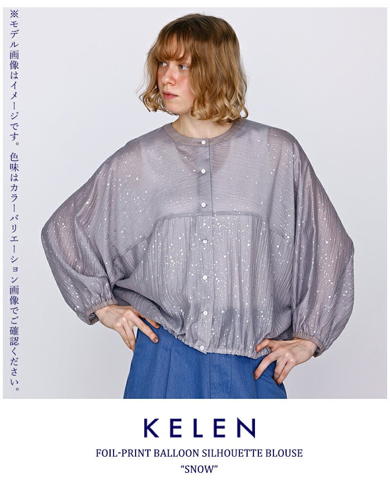 シアー素材繊細箔プリント存在感あるデザイントップス大人らしい印象ドルマンスリーブバルーンシルエットリラックス感立体感レイヤードスタイル空調対策 kelen ケレン 箔プリント バルーンシルエット ブラウス “SNOW” lkl26hbl2284 レディース 2026ss新作 春夏