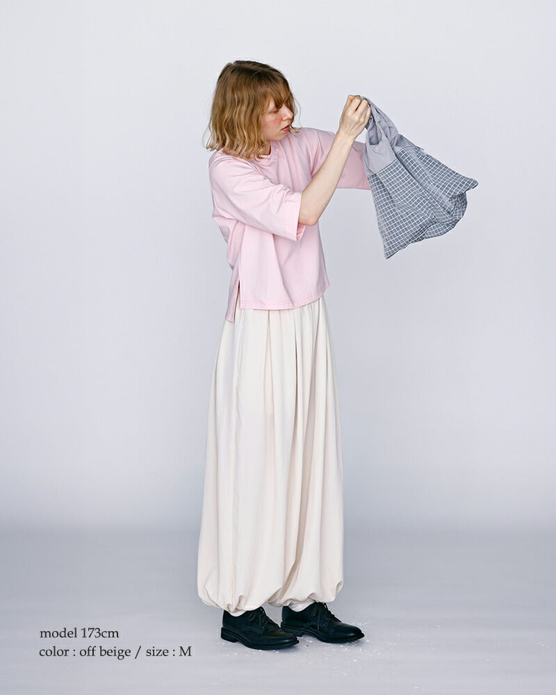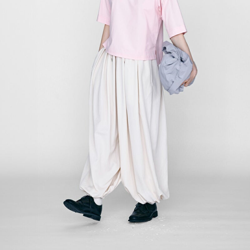 サイドから見ても美しく映える、立体的なバルーンフォルム。 落ち感のある素材が縦のラインを強調し、ボリュームがありながらもすっきりとした印象に。 足元に自然なたまりをつくるシルエットが、抜け感のある大人のリラックススタイルを演出します。