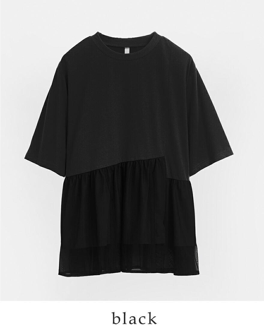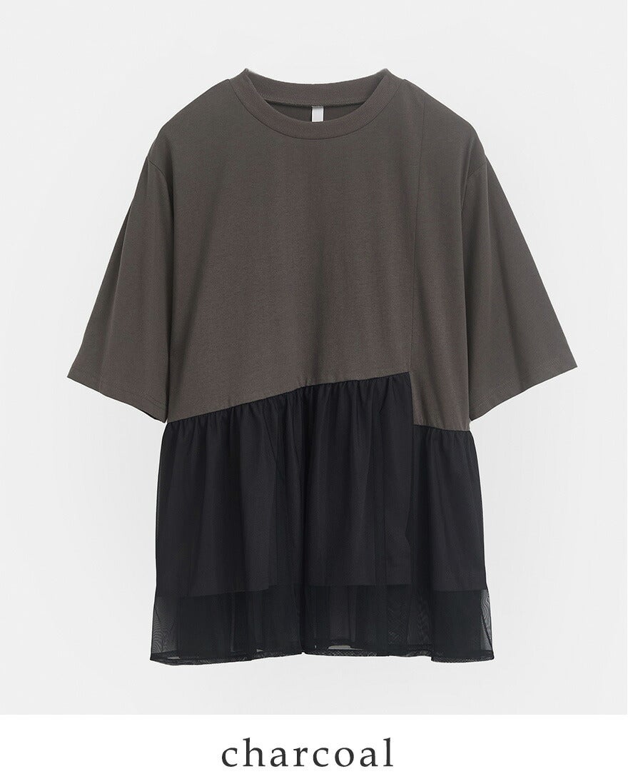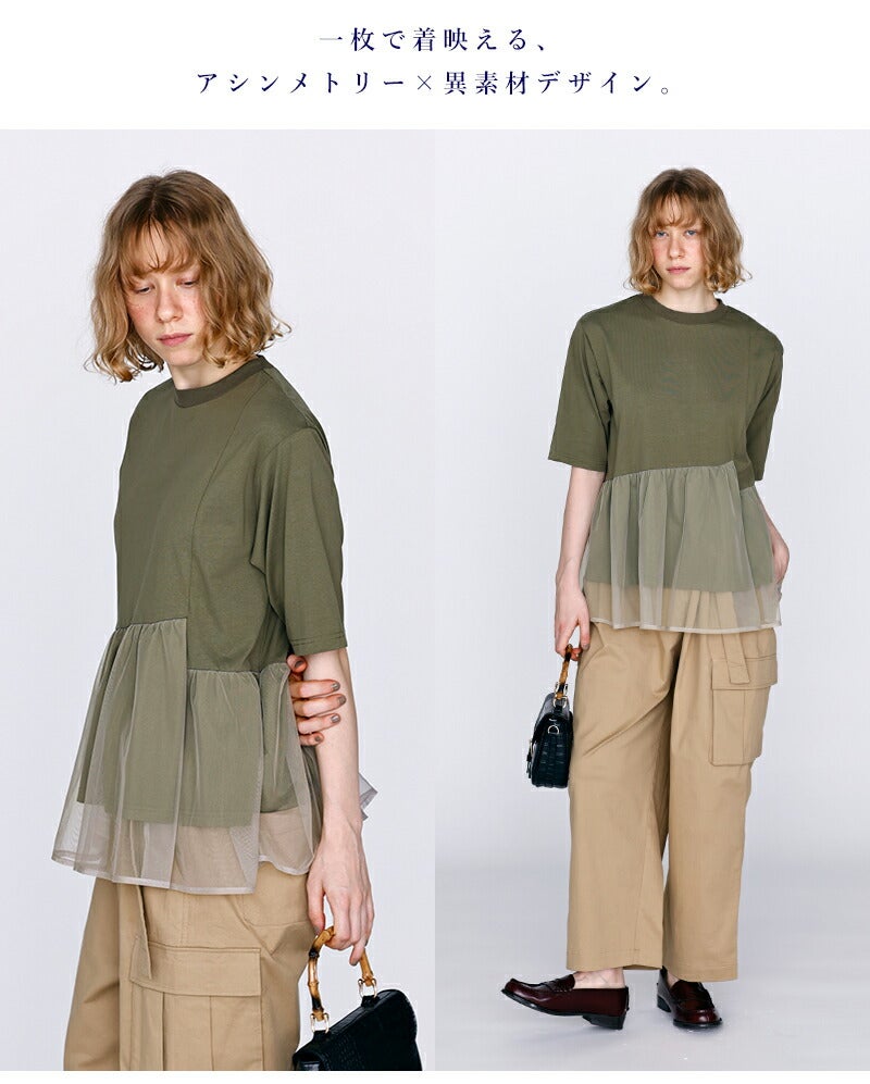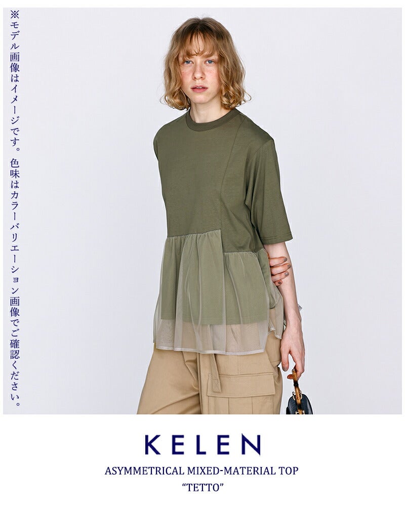 薄手でさらりとした肌触りの綿100%天竺カットソー素材を使用したアシンメトリーで魅せる軽やかな異素材トップス kelen ケレン アシンメトリー 異素材コンビ トップス “TETTO” lkl26hcs2023 レディース 2026ss新作 春夏