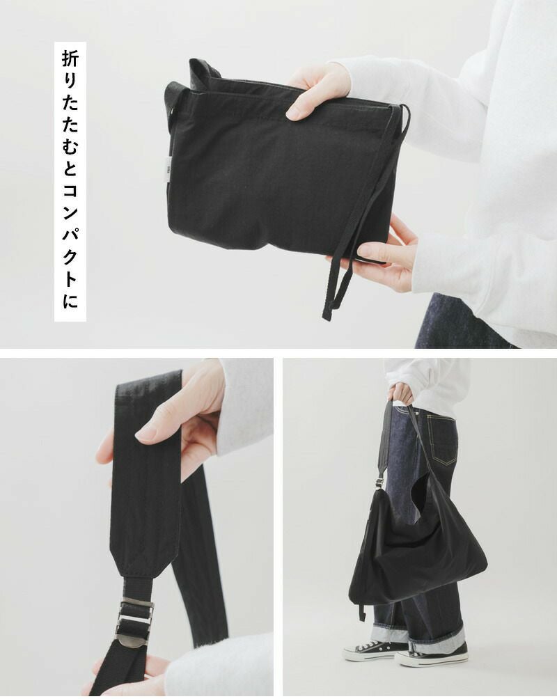 折りたたむとコンパクトになります。幅広のショルダーストラップで、肩への負担を軽減してくれます。