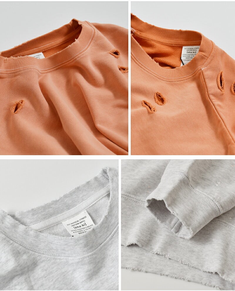 kha:ki(カーキ)より、コットンフレンチテリー ダメージペイント スウェットシャツ “DAMAGE PAINT SWEAT SHIRTS”のご紹介です。職人の手作業によるフェード感のあるダメージ加工とハンドペイントが特徴的なルーズシルエットのスウェットシャツです。それぞれの色目で加工内容やペイントカラーに変化をもたせた非常に手の込んだアイテムです。ワイドスクエアシルエット、ドロップショルダーでイージーな着用感に仕上げました。