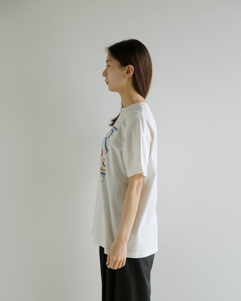 製品染めを施した生地がヴィンテージような風合いのTシャツ。フロントの大胆なグラフィックデザインはどこかクラシカルな印象で気品があり、カジュアルなTシャツを洗練された1枚にブラッシュアップしています。ゆとりのあるオーバーサイズで、リラックスした大人のTシャツスタイルを楽しめます。