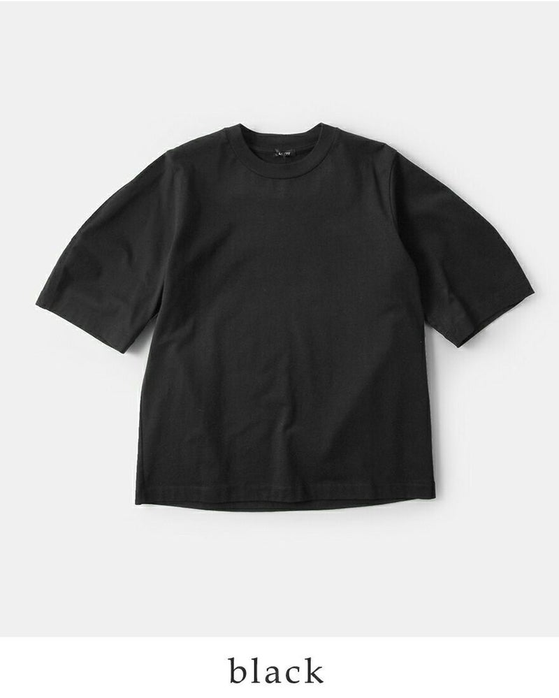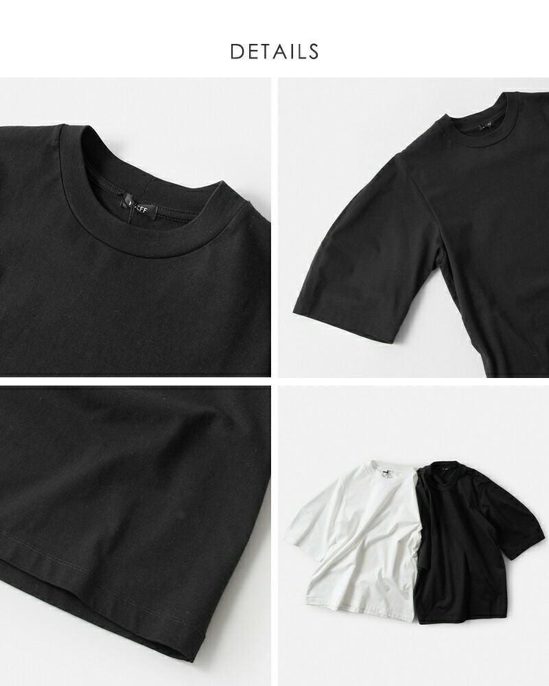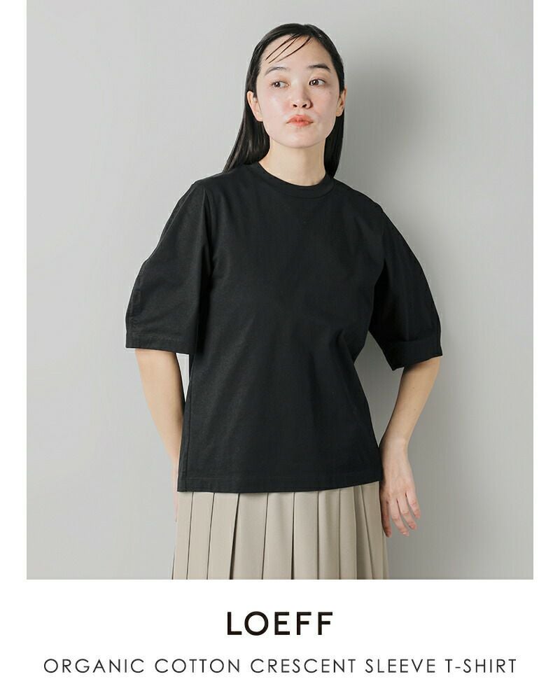 LOEFF(ロエフ)よりオーガニックコットン 天竺 クレセント スリーブ プルオーバーのご紹介です。インナーの透け感が気にならないよう、肉感にこだわってお作りした天竺は繊維長が長いのが特徴のオーガニックコットン原料で、ヌメリ・光沢・柔らかさが特徴です。丸みがポイントの半袖丈のクレセントスリーブに、程よくゆったりめのボディでブラウスライクな印象になるTシャツです。