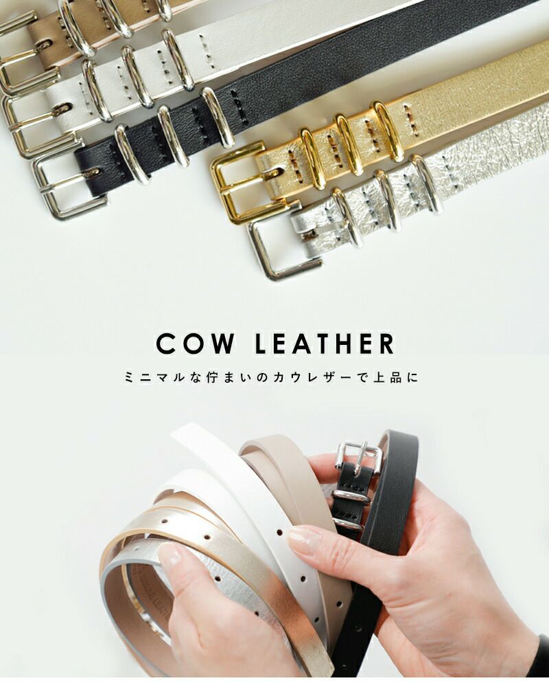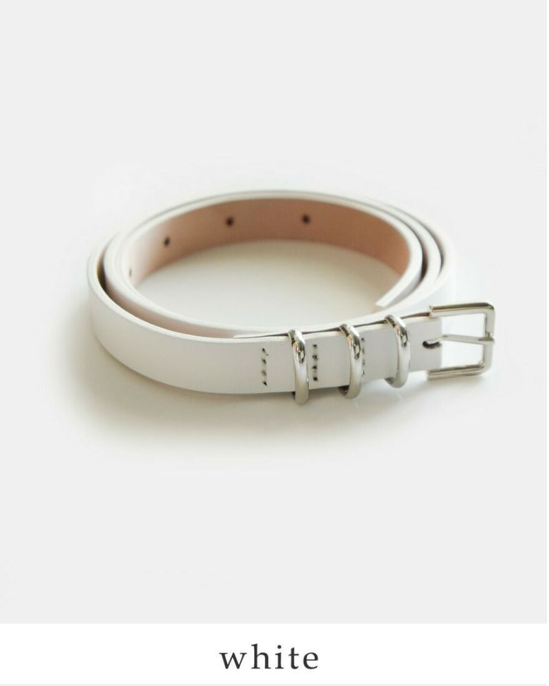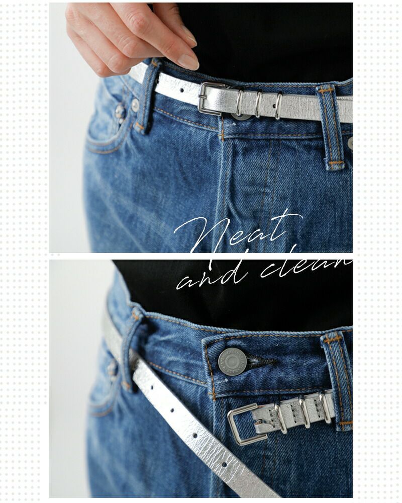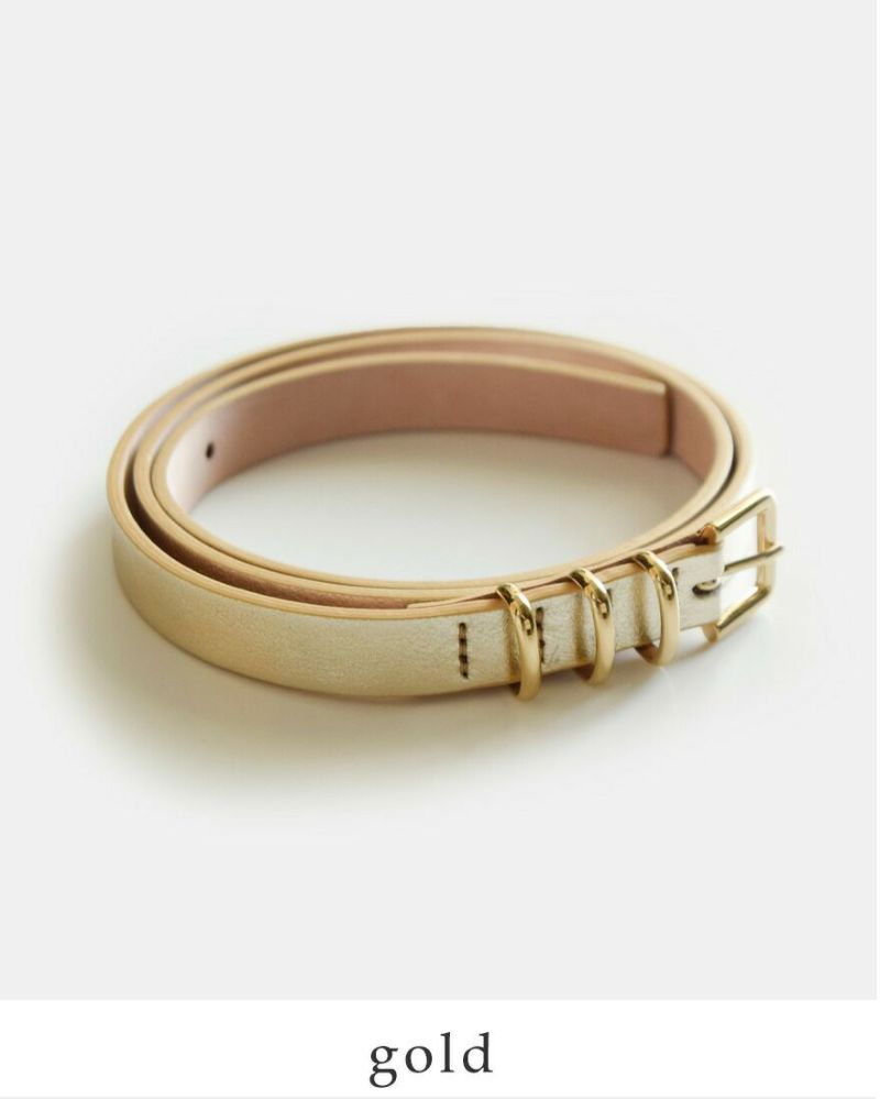 やや細めのベルト幅が女性らしく、上品な雰囲気を演出してくれるレザーベルト。長過ぎず扱いやすい長さで、腰回りもすっきり。3つならんだメタルバックルがコーディネートの程よいアクセントになってくれます。