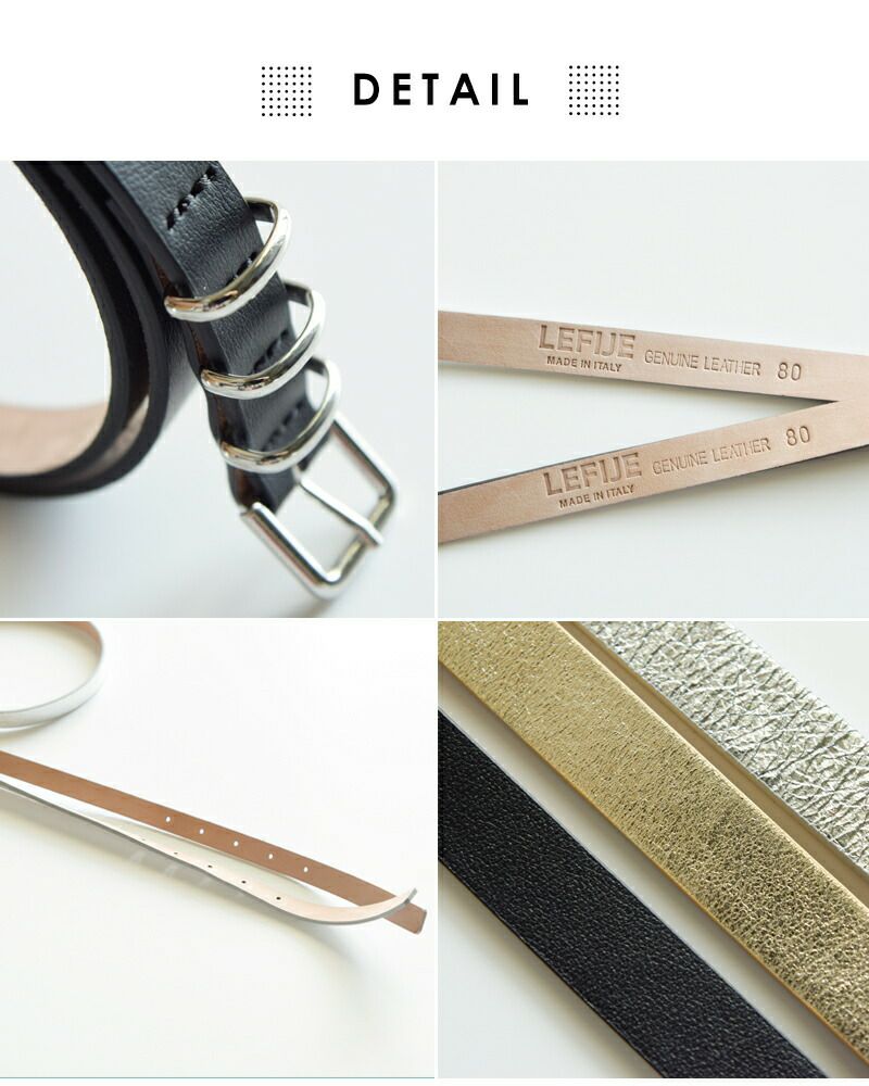 LEFIJE(レフィエ)より、カウレザーベルト“Tresor / Laminato”のご紹介です。ミニマルな佇まいのカウレザーに三連のメタルバックルが映えるベルト。しなやかで上質な本革を使用。onでも使いやすいプレーンカラーとoffにおすすめのメタリックカラーを揃えました。やや細めのベルト幅でパンツはもちろん、シャツやワンピースにウェストマークするだけでスタイリングにシャープさをプラスしてくれます♪
