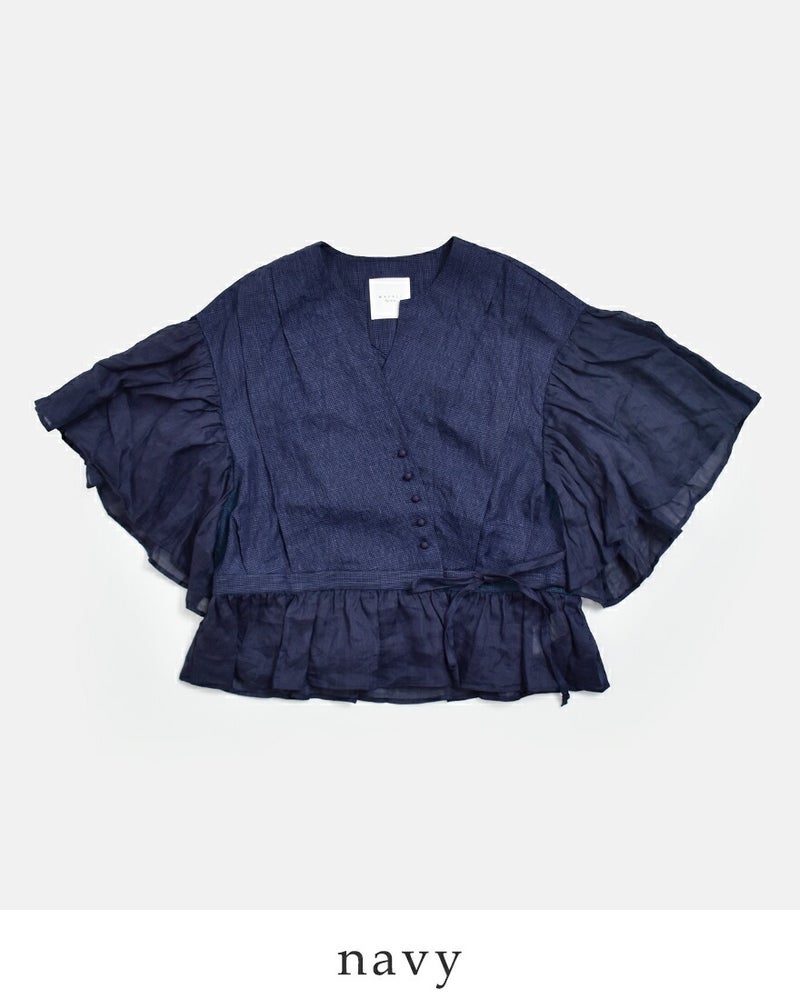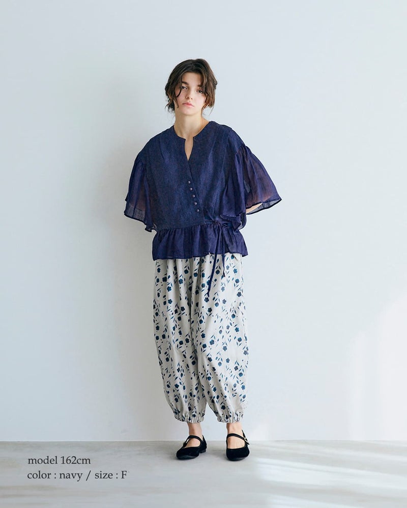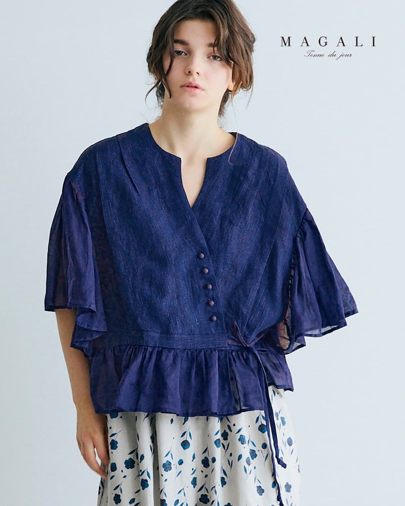 MAGALI(マガリ)より、インディゴリネンカシュクールブラウスのご紹介です。落ち着きのあるインディゴカラーと、空気を含むような軽やかな袖が印象的な一着。斜めに重ねたカシュクール仕立てにウエストリボンを添えることで、自然なドレープと柔らかなニュアンスを生み出します。アシンメトリーに並ぶくるみボタンや、たっぷりとギャザーを寄せたワイドスリーブが、静かな個性と優美な佇まいを演出。前を留めてブラウスとして、開けて羽織りとしても楽しめる2way仕様で、着こなしの幅が広がります。