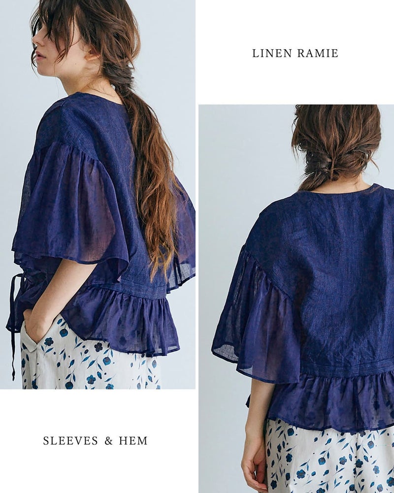 スリーブと裾にはフレア素材をあしらい、ふわりと広がる女性らしいシルエットに。軽やかでほんのり透け感のある生地が、動くたびにやさしく揺れ、涼やかな印象を演出します。