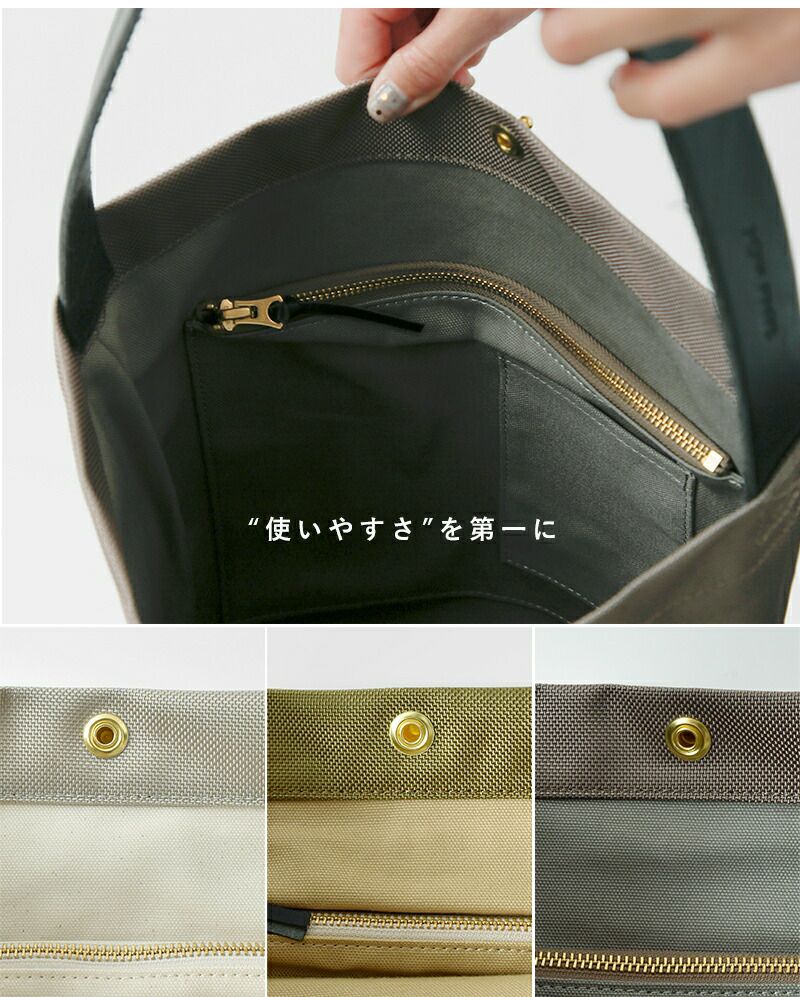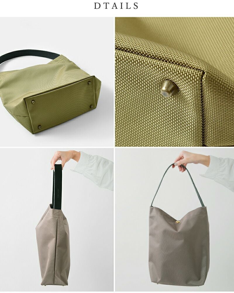 高強力・耐摩擦性・耐熱性に優れ、車のエアバッグなどにも使われる[66ナイロン]という高級素材を使用。角や底がすり減りにくく、ハードな使用にも耐えうるハイグレードな生地です。厚みがありながらも軽量で、オックス調に編んだ生地は艶があり、落ち着いた上品な雰囲気に仕上がっています。