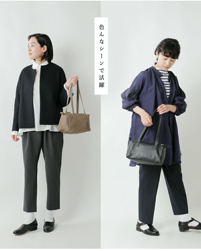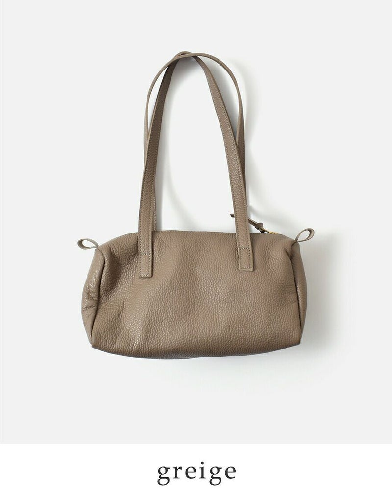 コンパクトなボストンデザインが可愛い、牛革シュリンクレザーのショルダーバッグ。オフィススタイルや、かしこまった場所へのお出かけスタイルにピッタリ。上質なレザーがキレイめコーデによく合います。