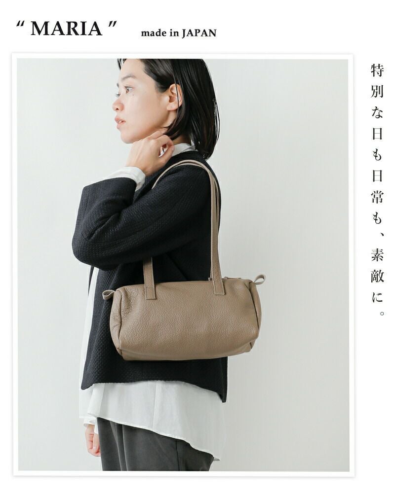 MARINE DAY(マリンデイ)よりシュリンクカウレザーボストンバッグ“MARIA”のご紹介です。ころんと丸みのあるボストン型がかわいい、レザーバッグ。肩掛け・手提げ両方で持てる丁度良い長さのショルダーで、使いやすいのも特徴です。シンプルなのでどんなスタイリングにも溶け込み、お出かけスタイルやカジュアルスタイルにもグッと上品に格上げしてくれます。