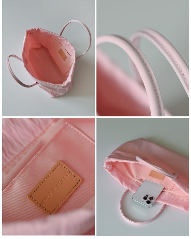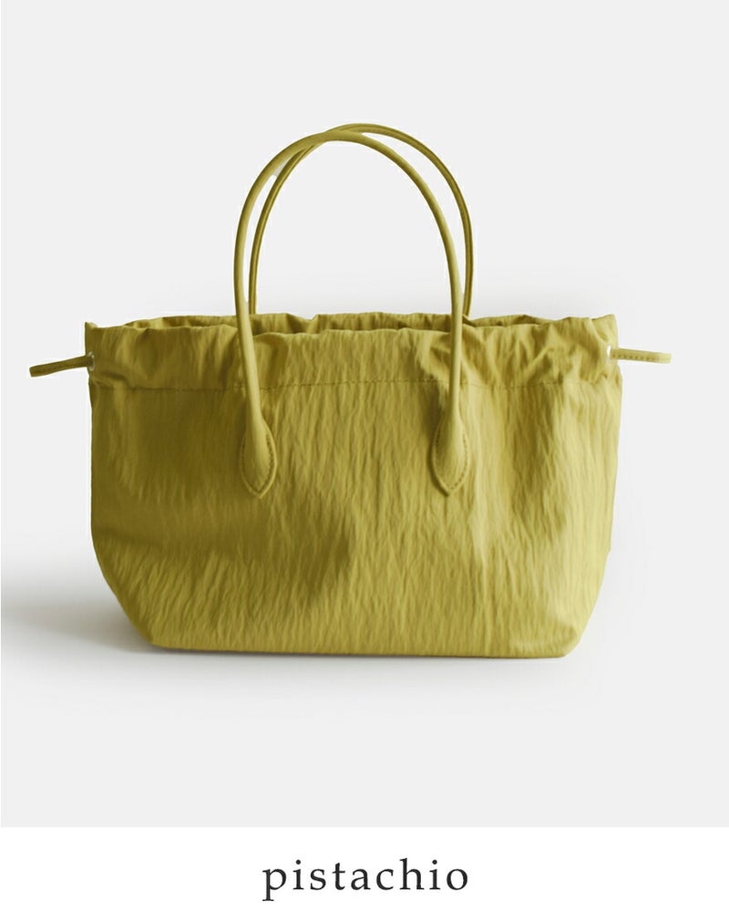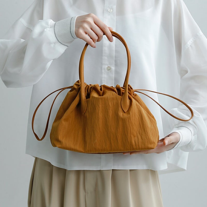 MARY AL TERNA(メアリオルターナ)より、リサイクルナイロン 巾着 ハンドバッグ “WRING”のご紹介です。ナイロン特有の光沢感を軽減させるために生地に塩縮加工を施したリサイクルナイロン100%の素材を使用したハンドバッグ。巾着型の広い間口で必要なだけ開閉でき、荷物の出し入れも楽々。スタイルも2way仕様で様々なシーンでの活躍が楽しめます。しっかりとした生地なので通勤・通学にも安心。