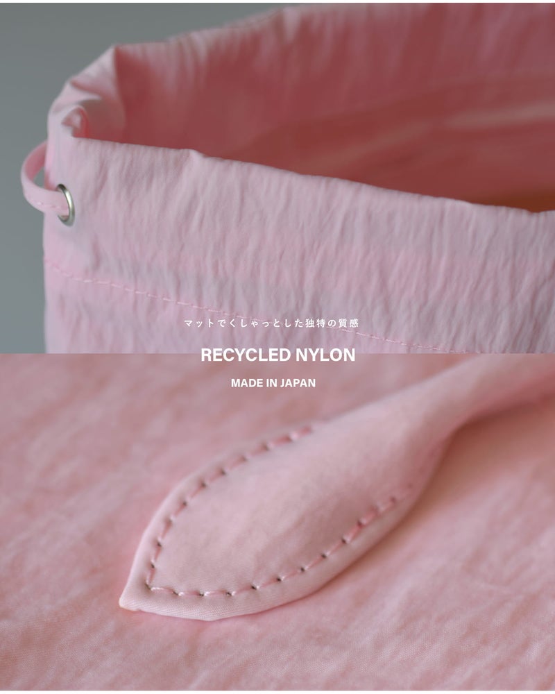 ナイロン特有の光沢感を軽減させるために生地に塩縮加工を施したリサイクルナイロン100%の素材を使用。表面感があり、明暗の出る高級感のある風合い。しっかりとした生地なのでデイリーユースにも安心。美しい発色とくしゃっとした独特の質感、マットな質感が上品さをプラスします。
