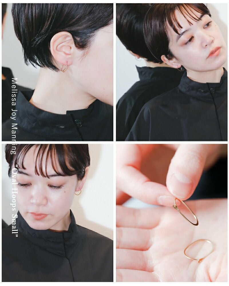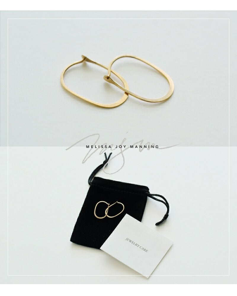 Melissa Joy Manning(メリッサ・ジョイ・マニング)より、14kt オーバル フープ ピアスのご紹介です。直径1mmほどの丸い棒状のゴールドのみを使い、1点1点丁寧にハンマーで叩いて作られた楕円形のピアス。極めてシンプルな形ですが、それゆえハンドメイドの質感を感じることが出来ます。10年以上作り続けられているメリッサの定番的なアイテムです。