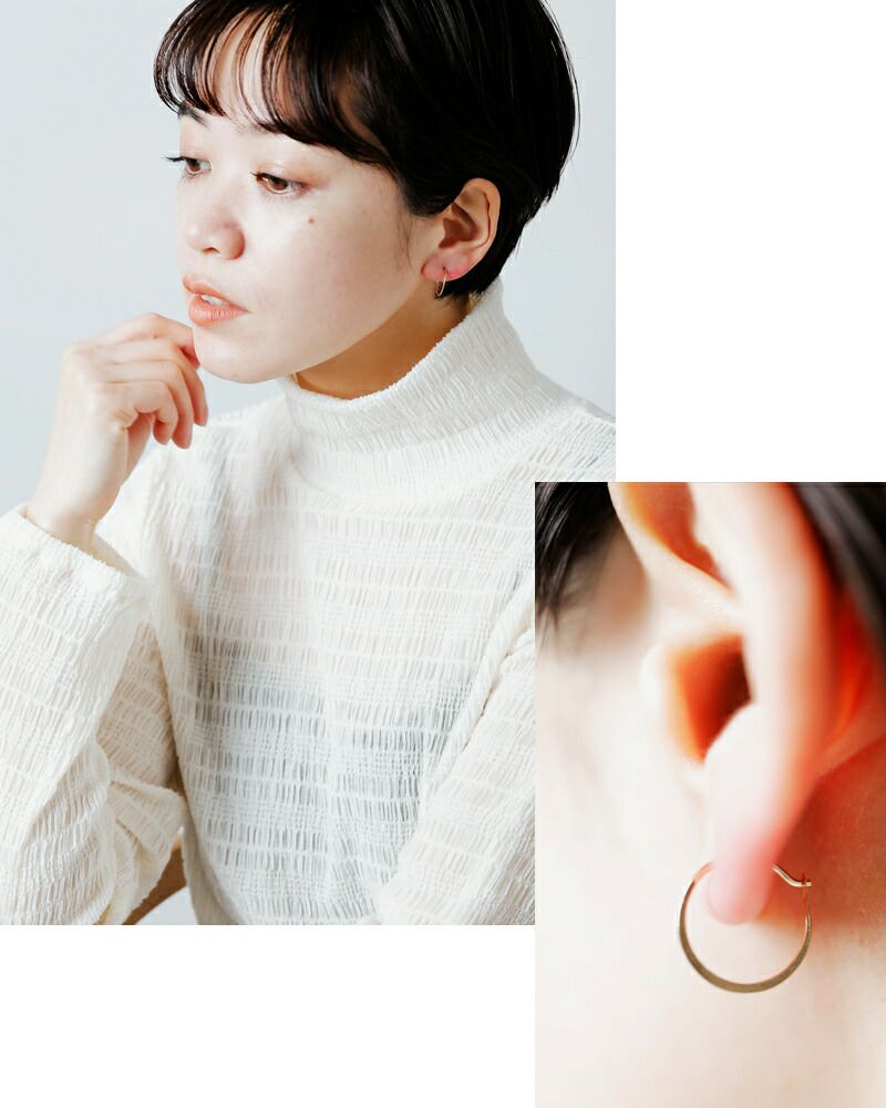 厚みがなく、薄くて1.5cmほどのラウンドフープピアス。小さくても十分な存在感があり、無駄を削ぎ落とした洗練デザインは、どんな服でもコーディネイトを引き締め、ワンランク上のスタイリングへ導きます。