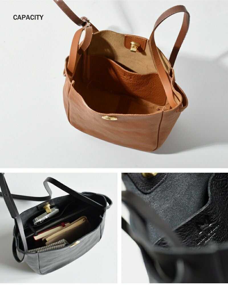 マチがしっかりとあるので、コンパクトながらも見た目以上に収納力があります。内側には小物の収納に便利なオープンポケットが付いています。しなやかなレザー素材なので容易に荷物が入れられます。