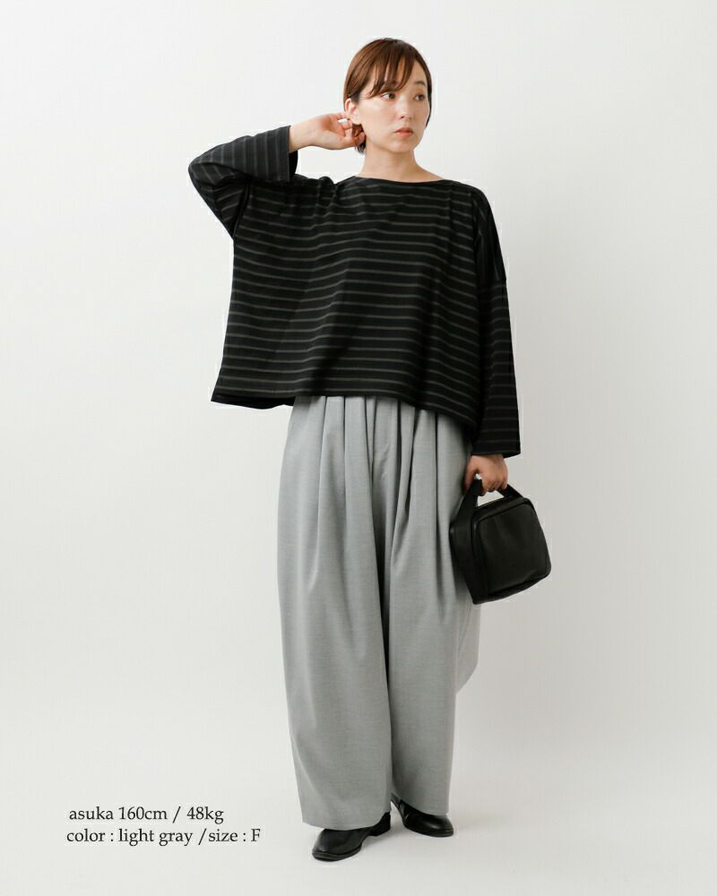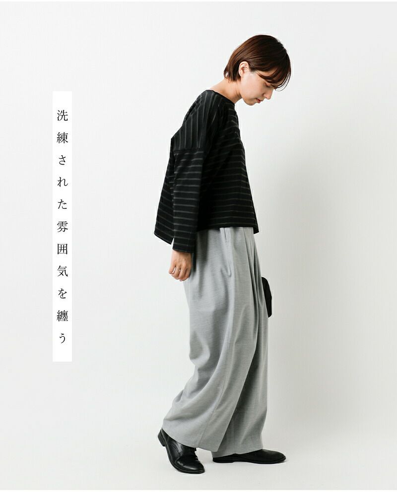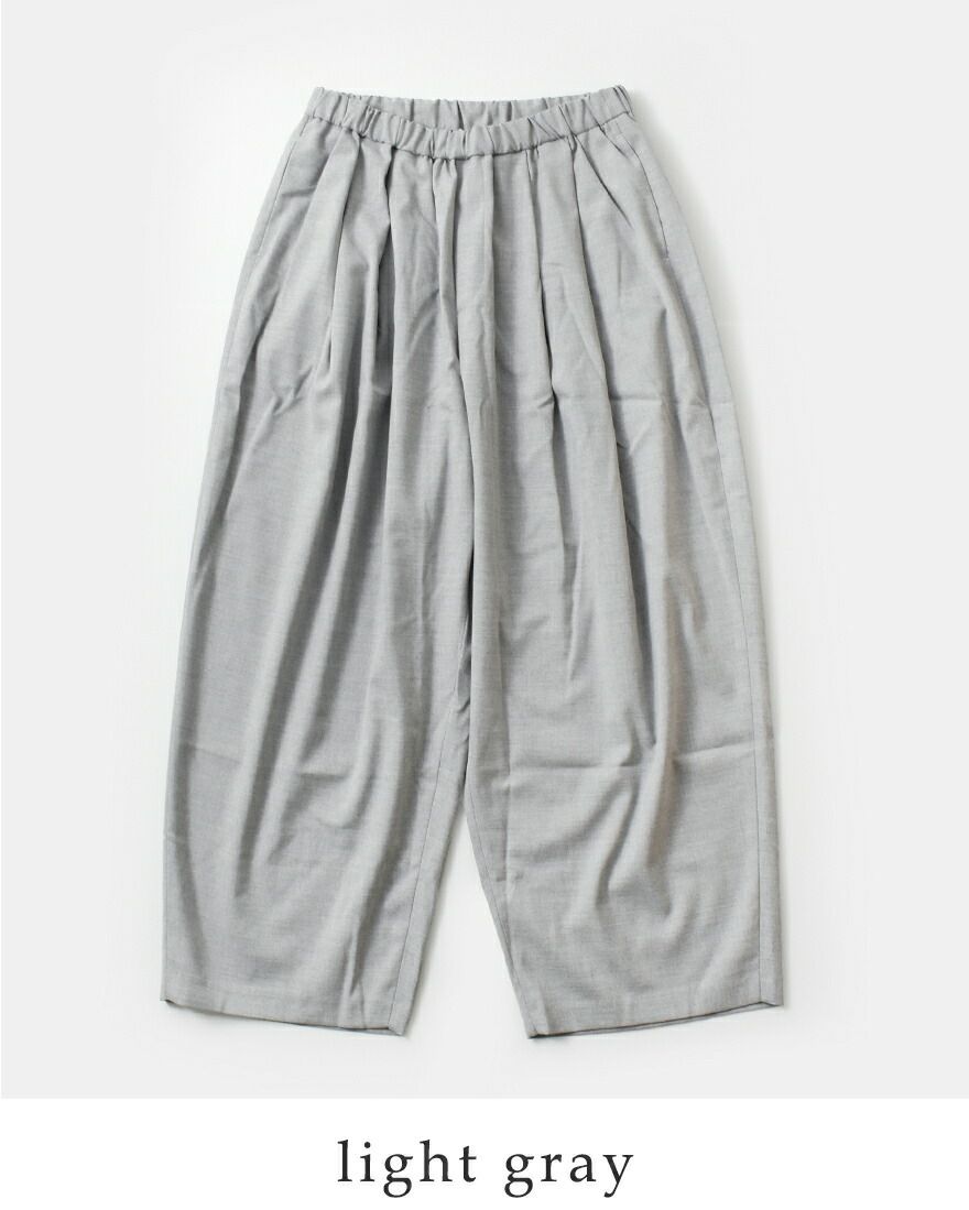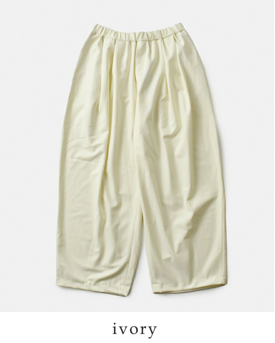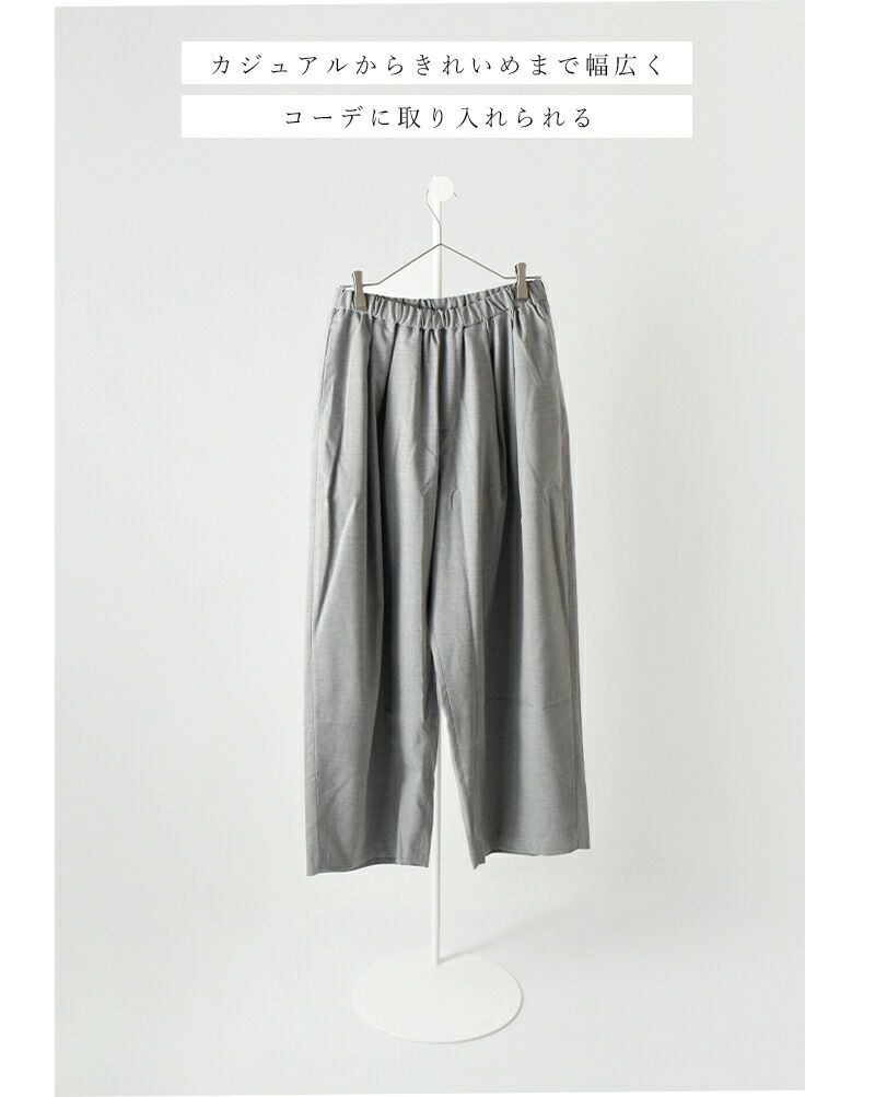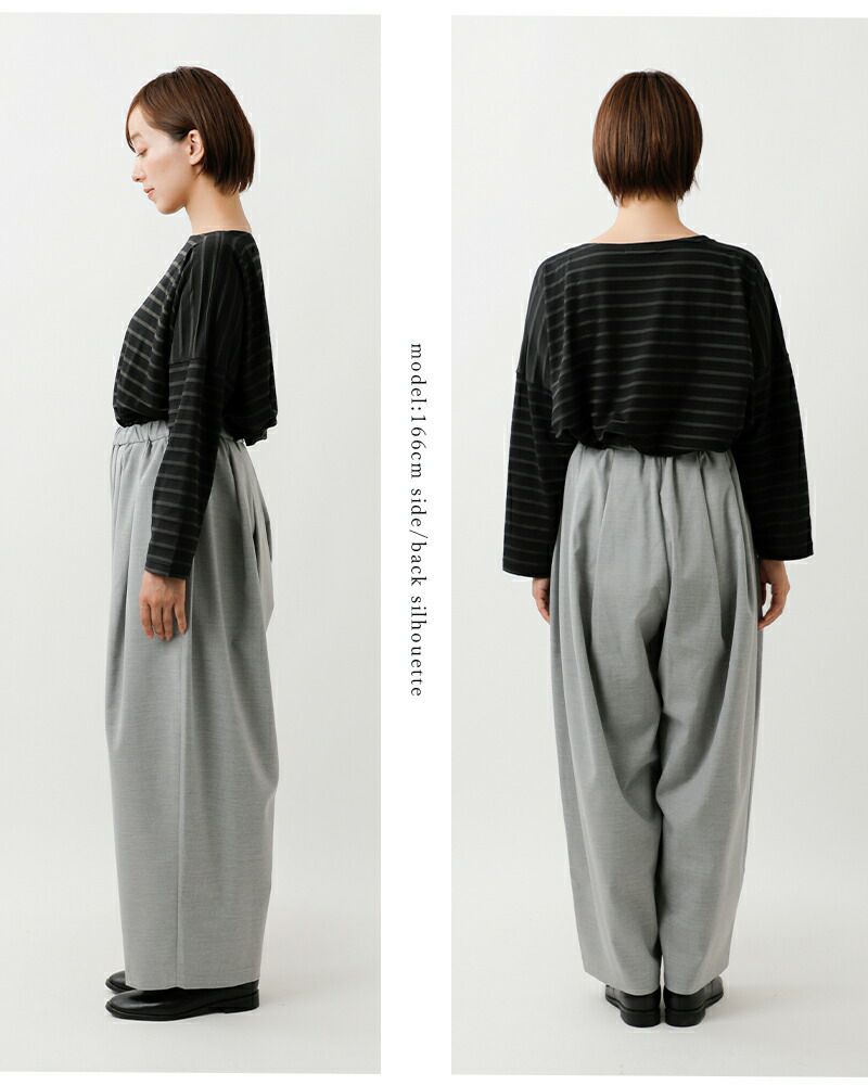 落ち度のある生地が、ウエスト下のタックをより引き立ったきれいめな表情に仕上げています。