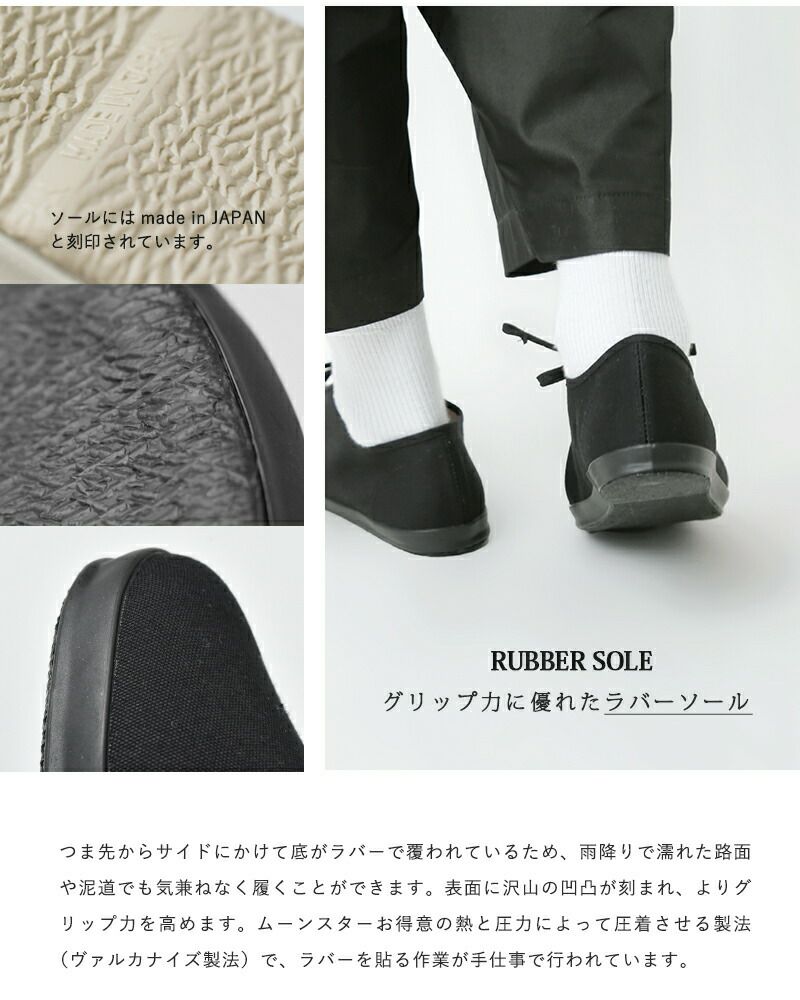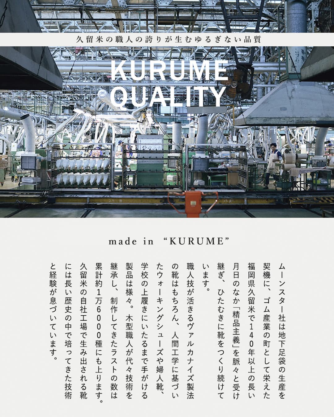 地下足袋の誕生からゴム産業の発展により栄えた久留米で、1873(明治6)年に足袋専門店「つちやたび店」として誕生したMoonstarムーンスター。140年以上の長い月日のなか脈々と受け継ぎ、ひたむきに靴を作り続けてきました。『一人ひとりのお客様に最適な靴をつくる』という想いは、まったく変わることがありません。 国内では、採用するところがわずかな手間のかかるヴァルカナイズ製法など昔ながらの製法を守り続けており、しなやかで丈夫な仕上がりと美しい風合いを叶えてくえます。ラスト(木型)職人が代々技術を継承し、長年蓄積された足型データをもとに組み立て、デザイン、素材、機能の分析を徹底的に行い、試作品の履き心地のチェックはもちろん、各種検査機器により品質を精査し、厳しい基準をクリアしなければいけません。妥協を許さない、ものづくりの姿勢。これがmoonstarの『精品主義』です。 ゴムの精錬、裁断や縫製に携わる職人だけでなく、工場で使用する靴型や機械にいたるまで、あらゆるものを社内でつくることができる職人集団として成長を続けおり、積み重ねてきた技と受け継いできた志、履きものの歴史を紡いできた誇りは、今も脈々と息づいています。