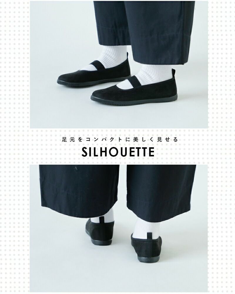 優しいフォルムのラウンドトゥ。甲をしっかりとホールドしてくれるゴムストラップは着脱もラクチンです。甲高さんも圧迫感なく履けます。インソールは起毛のある素材で素足でもさらっと心地よく履いていただけます。バックには着脱をサポートしてくれるタブ付き。タブ部分は生地を切り替え、さりげないアクセントに。