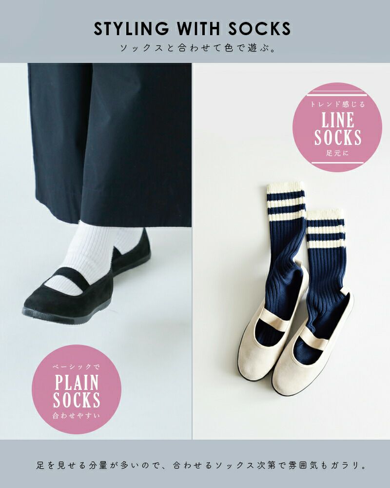 素足ではもちろん、ソックスと合わせたスタイリングも楽しめます。足を見せる分量が多いので、合わせるソックスによって雰囲気もガラリと変わります。シンプルな無地ソックスでベーシックに合わせてもおしゃれ。トレンドのラインソックスと合わせてスクール感を強調するのも可愛いですよ♪
