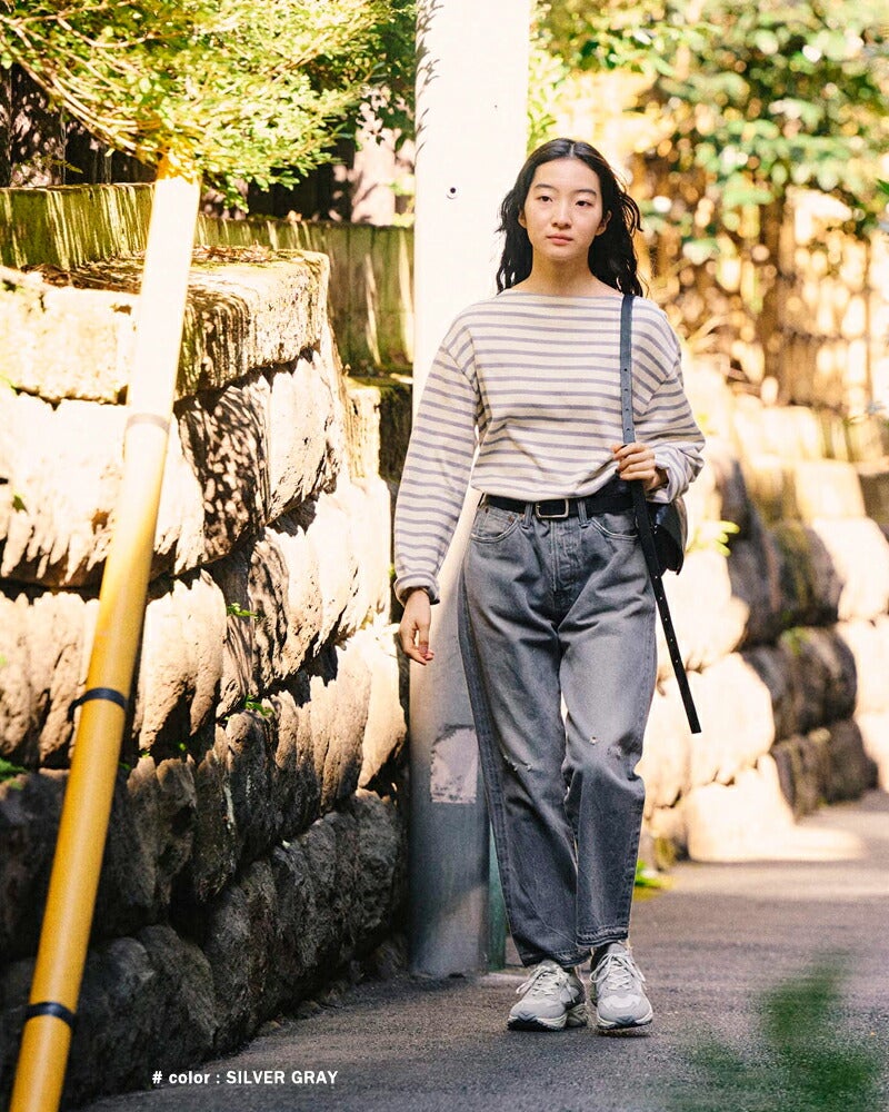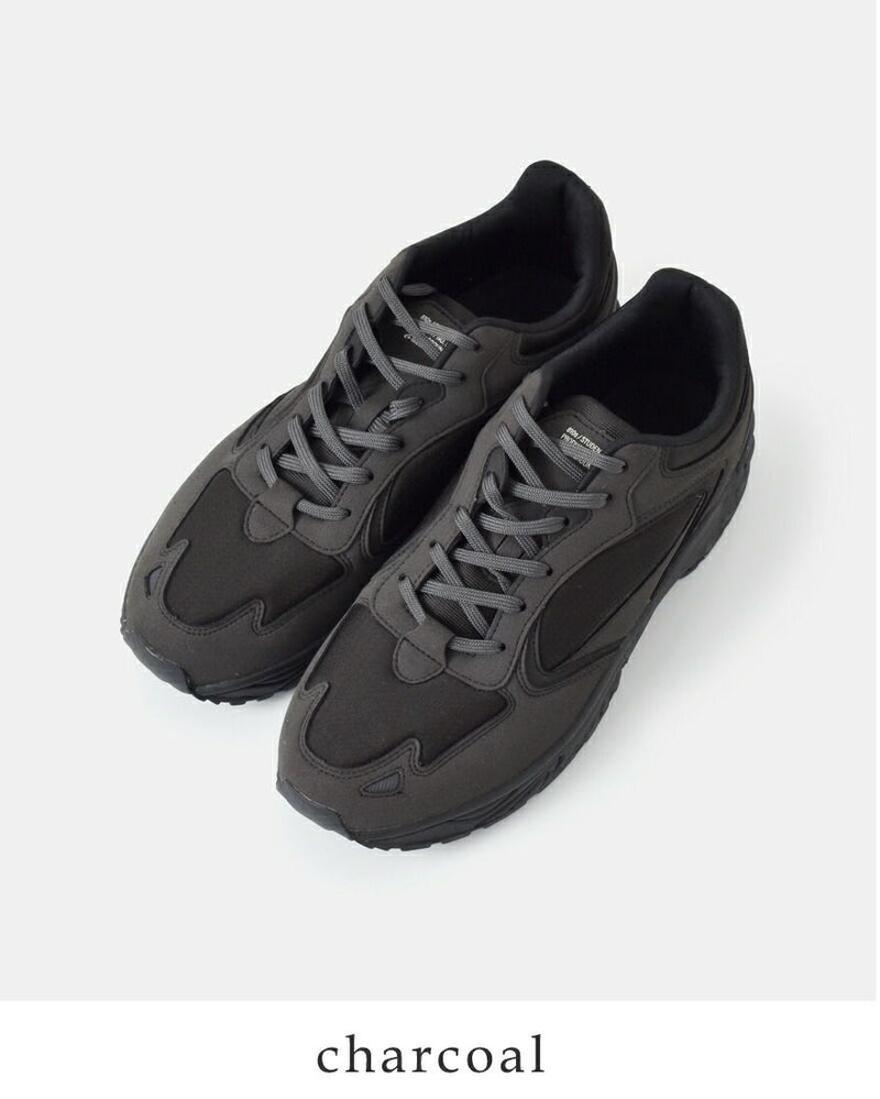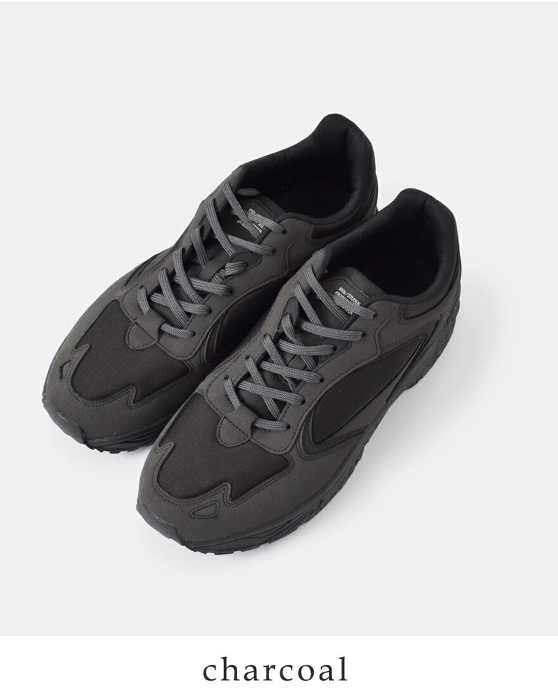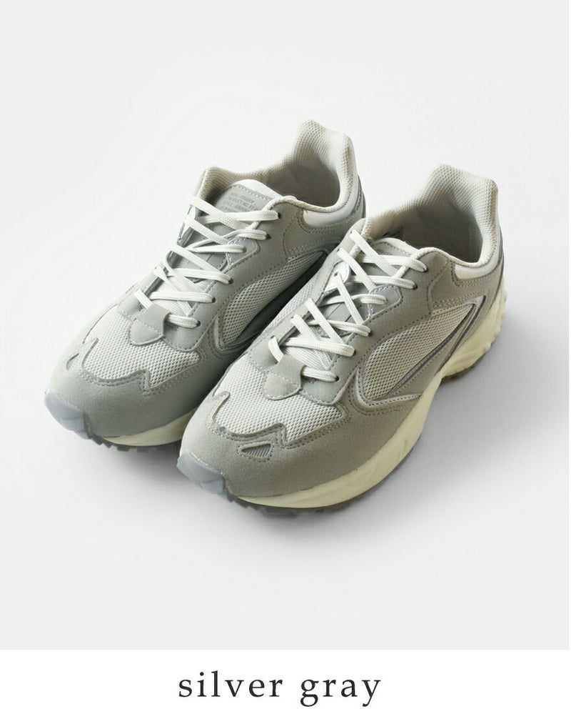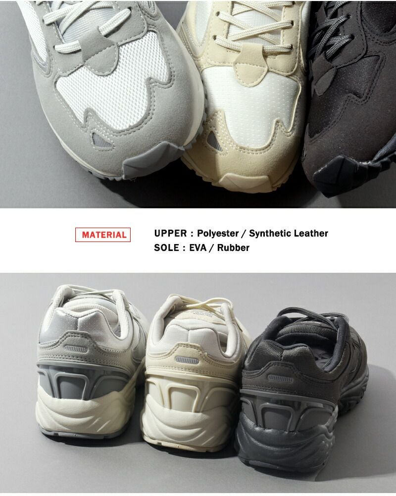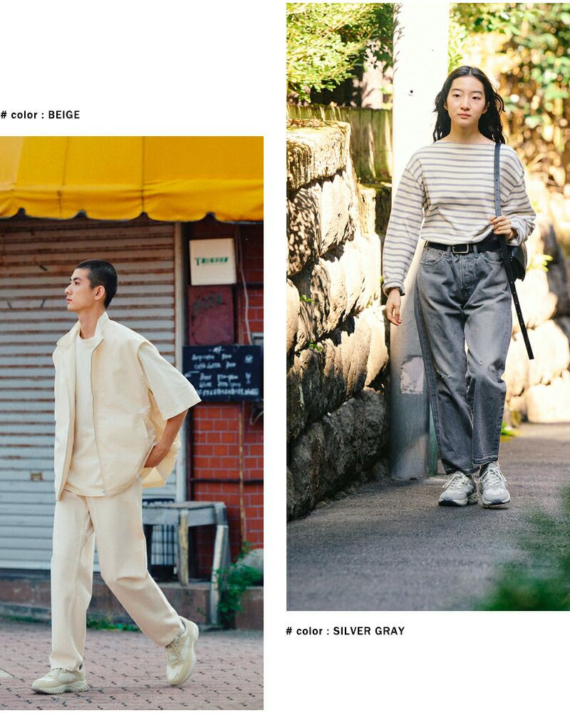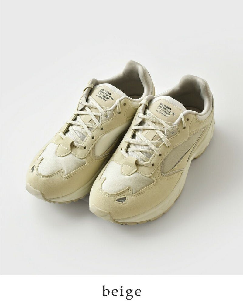 上品な雰囲気にまとめたジョグタイプスニーカーです。オリジナリティ溢れる切り替えと、ソールの波型が特徴のデザイン。