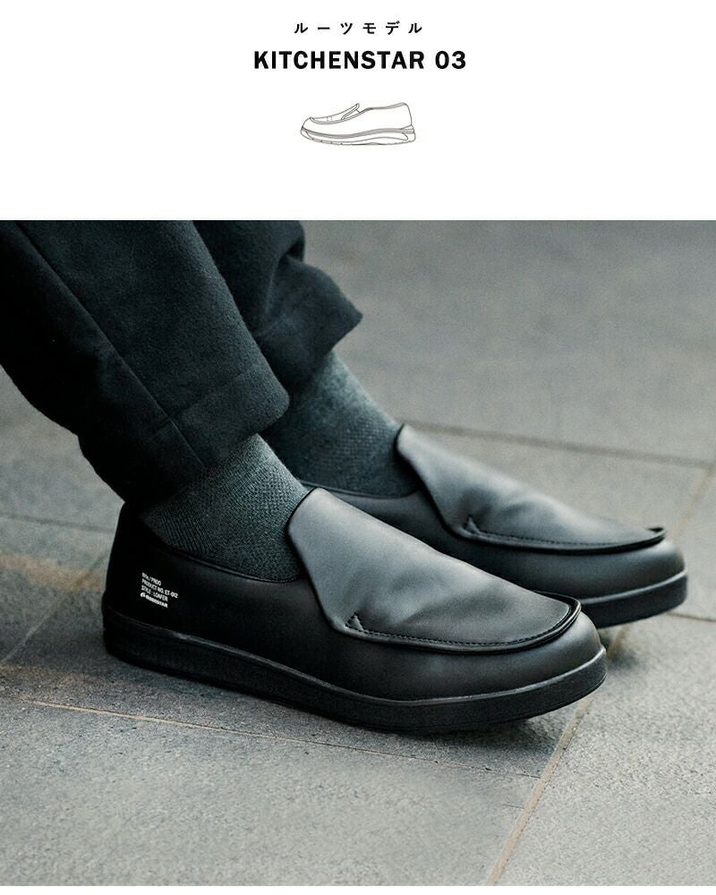 PROOのルーツモデル「KITCHENSTAR 03」は、キッチンスターシリーズの中でも、上品な佇まいがワークスタイルに適した03モデル。マルチストッパーソールを搭載し、アッパーには丈夫で耐油性に優れた合成皮革を使用。サイドのロゴがアクセントになっています。