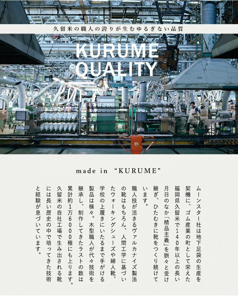 地下足袋の生産を契機にゴム産業の町として栄えた久留米で、 長きに渡り靴を作り続けてきました。 久留米の自社工場で生み出される靴には 長い歴史の中で培ってきた技術と経験が息づいています。 1873年の創業以来、一人ひとりに心地よい靴を目指し、 今日まで続けてきたまじめな靴作りに自信と誇りを持って “MADE IN KURUME”の靴をこれからも作り続けていきます。