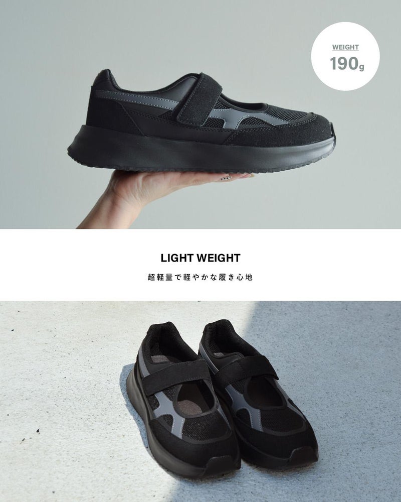 片足約190g(サイズ24.5cm計測)で、とても軽い履き心地。今っぽいボリューミーなソールながら、超軽量で長時間の外出でも疲れにくい仕様です。