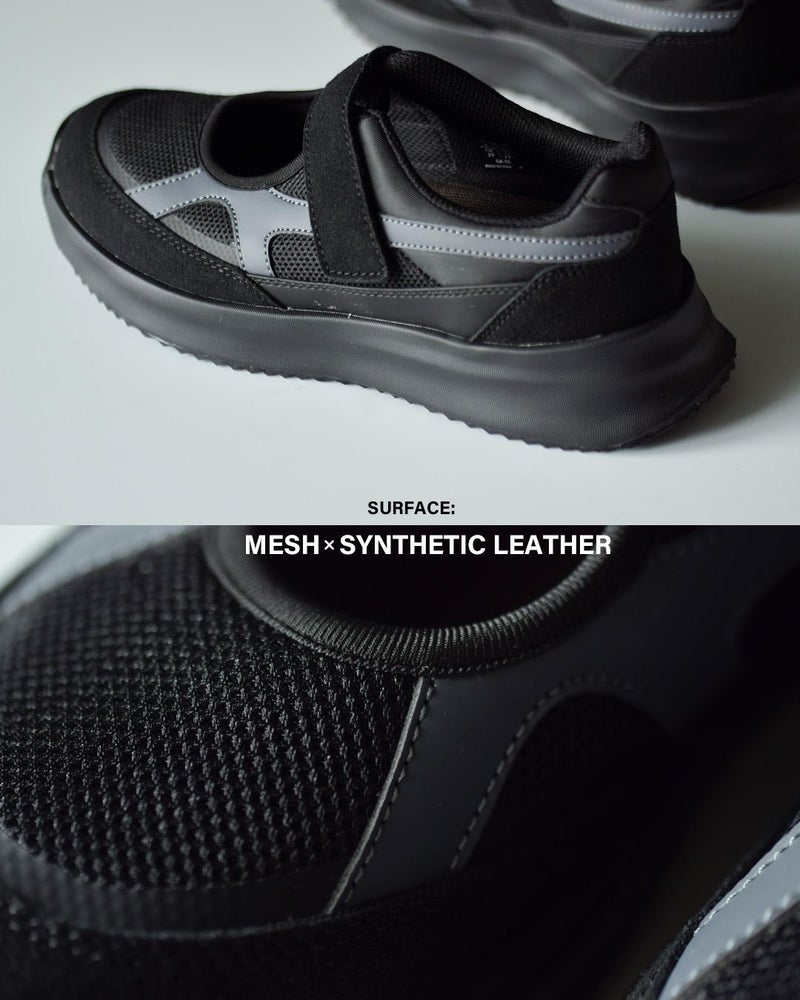 アッパーは、メッシュ×シンセティックレザーのコンビネーション。メッシュ部分は通気性がよく、足元のムレを軽減しながら軽快な印象に。一方で起毛素材がやわらかな質感をプラスし、スポーティーすぎない落ち着きを演出します。ブラックベースでも単調にならず、素材のコントラストで自然と表情が生まれるのが魅力です。