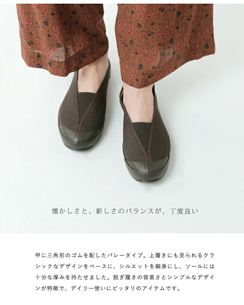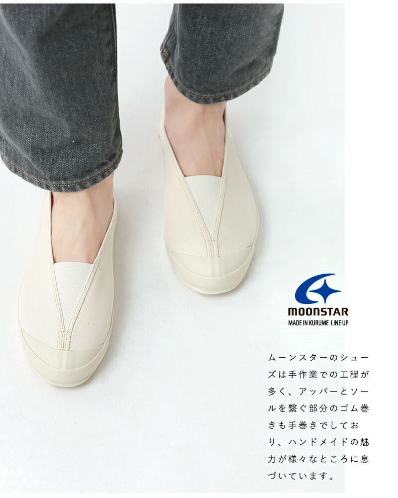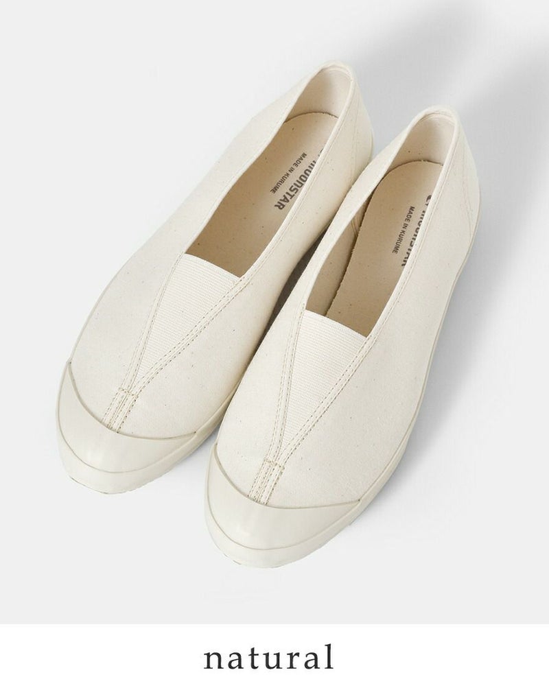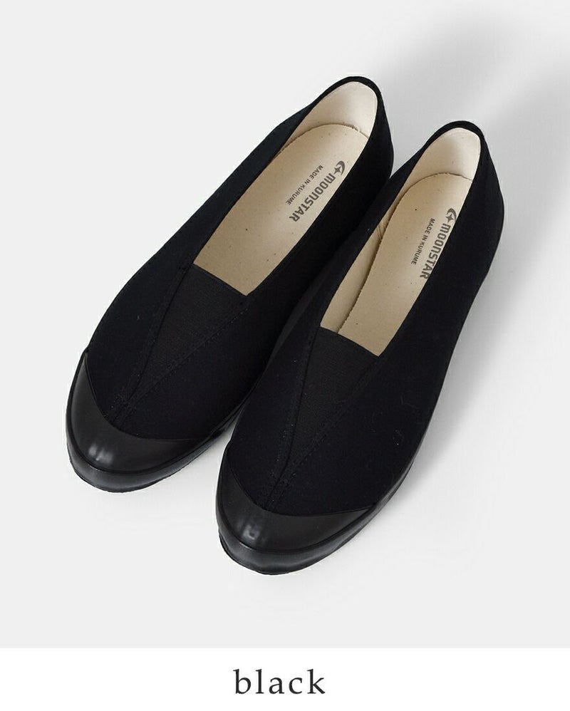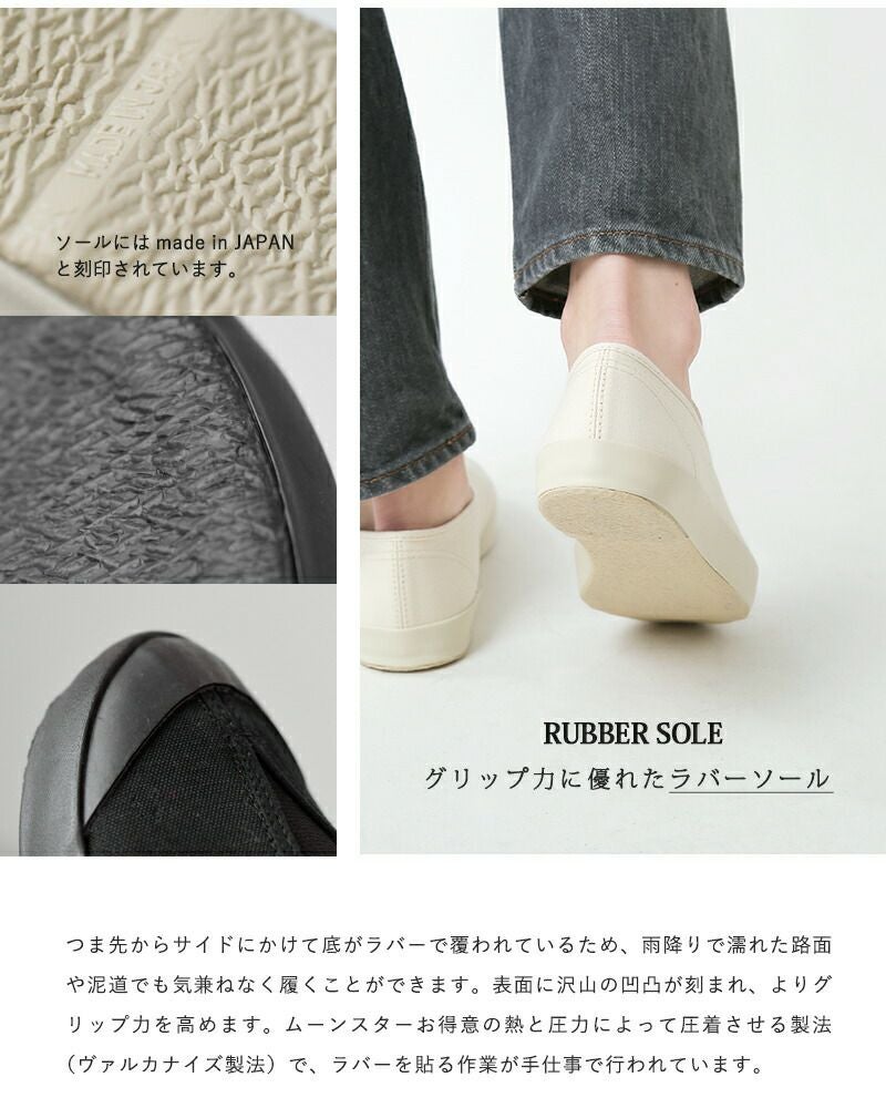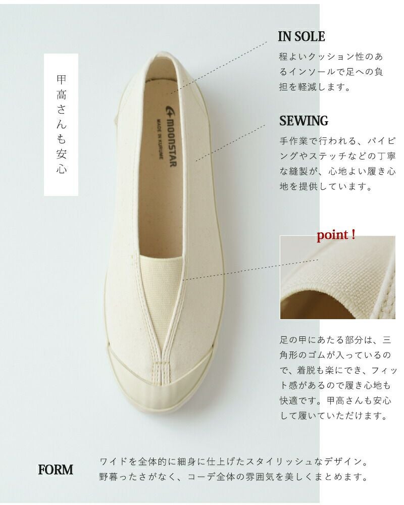 Moonstar(ムーンスター)よりキャンバスバレースリッポンシューズ“LITE BALLET”をご紹介します。甲に三角形のゴムを配したキャンバスシューズ。細身のシルエットでスタイリッシュで女性らしい印象です。ムーンスターならではのヴァルカナイズ製法で作られたソールは、しなやかで柔らかく壊れにくいという特徴があり、履き心地の良いことで有名です。着脱もしやすく、シンプルなので様々なスタイリングに馴染んでくれます。