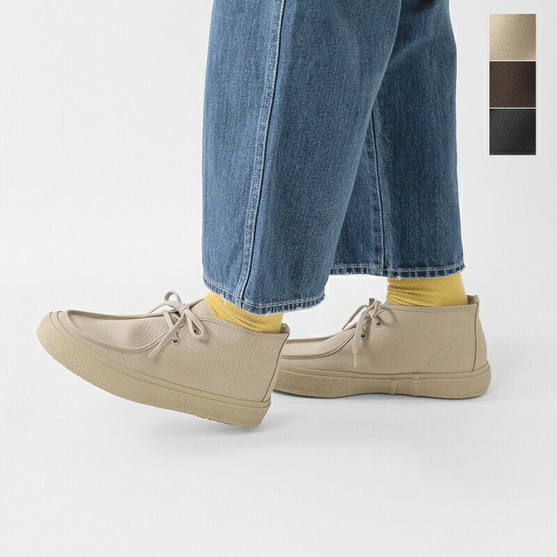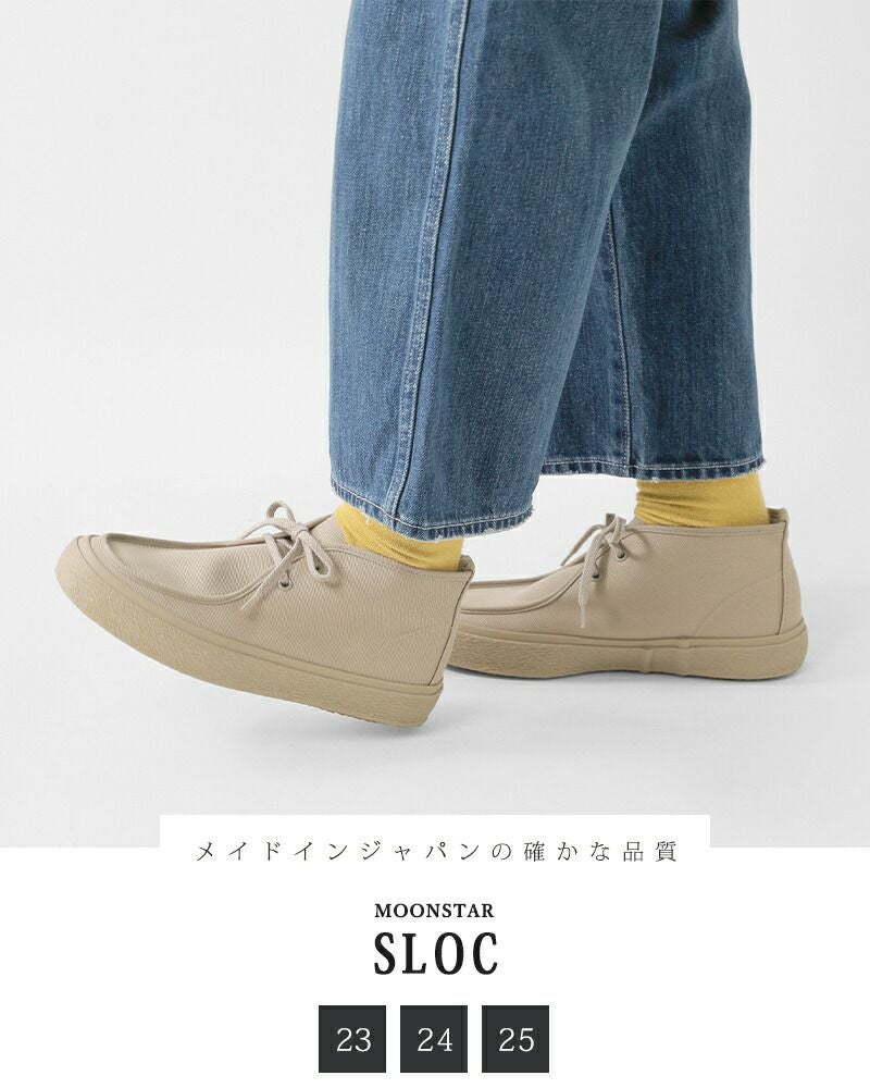 Moonstar(ムーンスター)よりキャンバス レースアップ モカシン シューズ “SLOC”のご紹介です。ゆったりとしたシルエットの木型を使用した二つ鳩目のミッドタイプ。キャンバスシューズでは珍しいモカ仕様が特徴的な一足です。日常使いはもちろん、ほど良いきちんと感を必要とするシーンなどの足元にも馴染みます。ムーンスターならではのヴァルカナイズ製法でしなやかで安定した履き心地を実現。ソールはグリップ力のあるラバーを使用し、雨の日でも滑りにくい仕様に仕上げました。