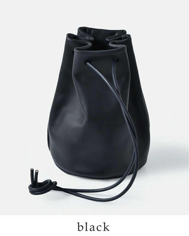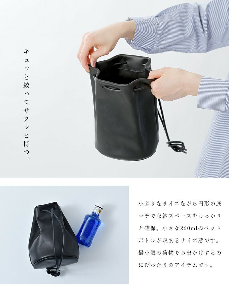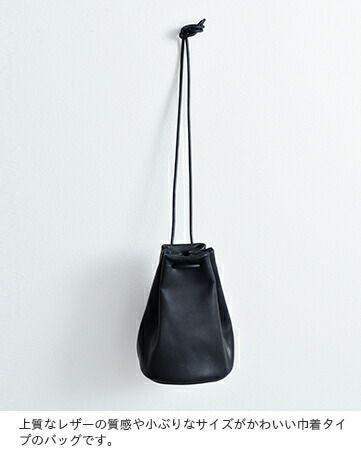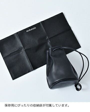 mormyrus(モルミルス)よりレザー巾着ハンドバックのご紹介です。片手で持つのにも丁度良いサイズ感の巾着バッグ。表面にしっとりとした艶感があるレザーを使う事でカジュアルさの中に大人な質感をプラスしています。内側には小物分け用のポケットが1ヵ所と、底のマチを円形にする事で収納スペースも確保した、使い勝手の良さもポイントです。紐の長さを調整し、肩から掛けたり手で持つ持ち方が可能です。
