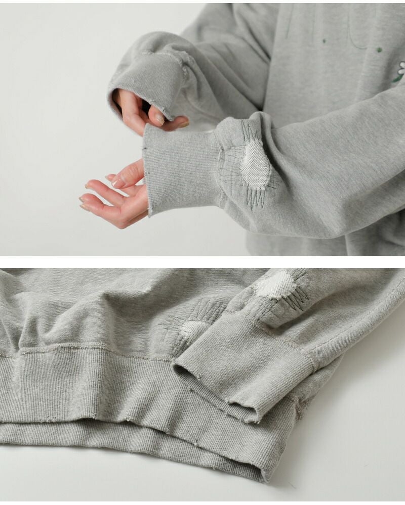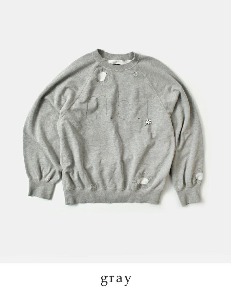 ■身頃にはあえてムラ感や擦れ感を出したダメージ加工。 ■着込んだようなヴィンテージライクな風合いを表現。 ■m.b.lのロゴステッチが主張しすぎないアクセントに。 ■さり気ないお花の刺繍で遊び心を。 ■あえて裏毛をパッチワークしたデザインも魅力的です。