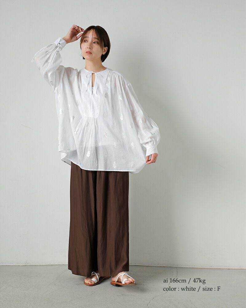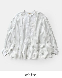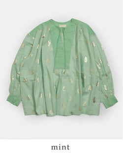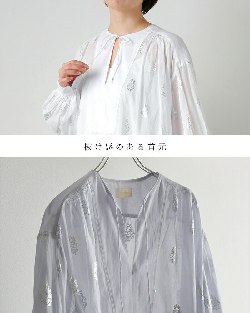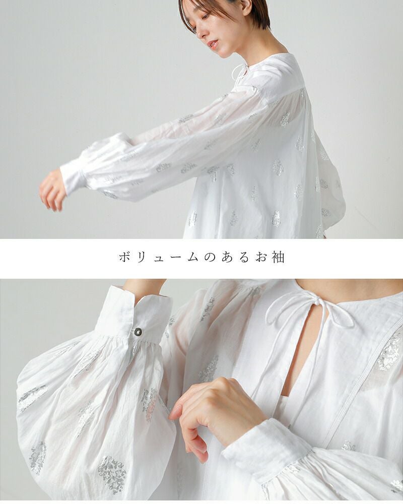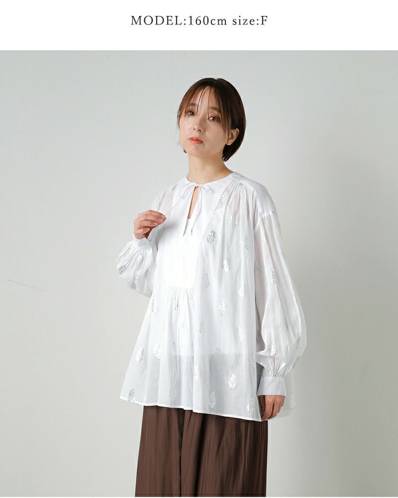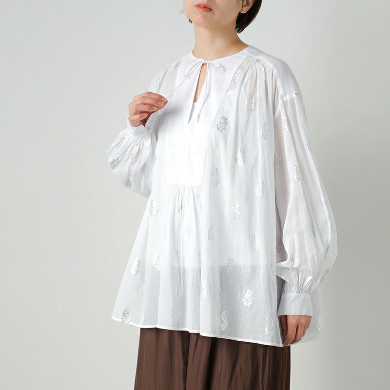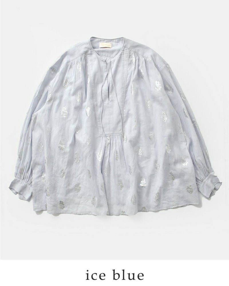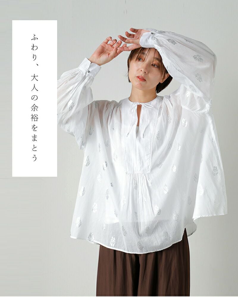 素材には通気性の良いコットンボイルを使用。 薄手で軽く、肌離れがよいため、ロングシーズン快適に着用いただけます。 繊細なフラワープリントに箔加工を施し、さりげない華やかさをプラス。 派手すぎず、光の加減で上品にきらめく大人のプリントです。
