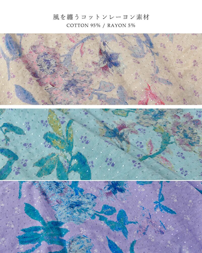風のように軽やかなコットン素材で、快適な着心地を叶えます。ほんのり光沢感のあるドット柄とブーケ柄の融合が、上品な華やかさを演出してくれます。
