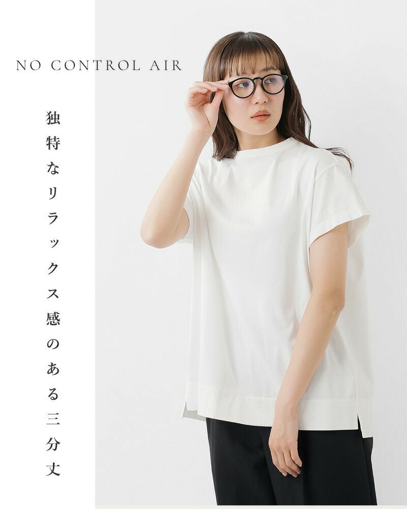 NO CONTROL AIR(ノーコントロールエアー)よりコットン シルケット ハイゲージ 天竺 3分袖 ラウンドネック プルオーバーのご紹介です。ゆるめの身幅で着心地のよい3分袖カットソー。首回りは大きく開きすぎないやや詰まったデザインで、Tシャツながらもきちんとした印象です。夏場にさらりと一枚でももちろん、詰まった首回りを活かしてレイヤードのインとしても大活躍。ユニセックスで使えるデザインです。
