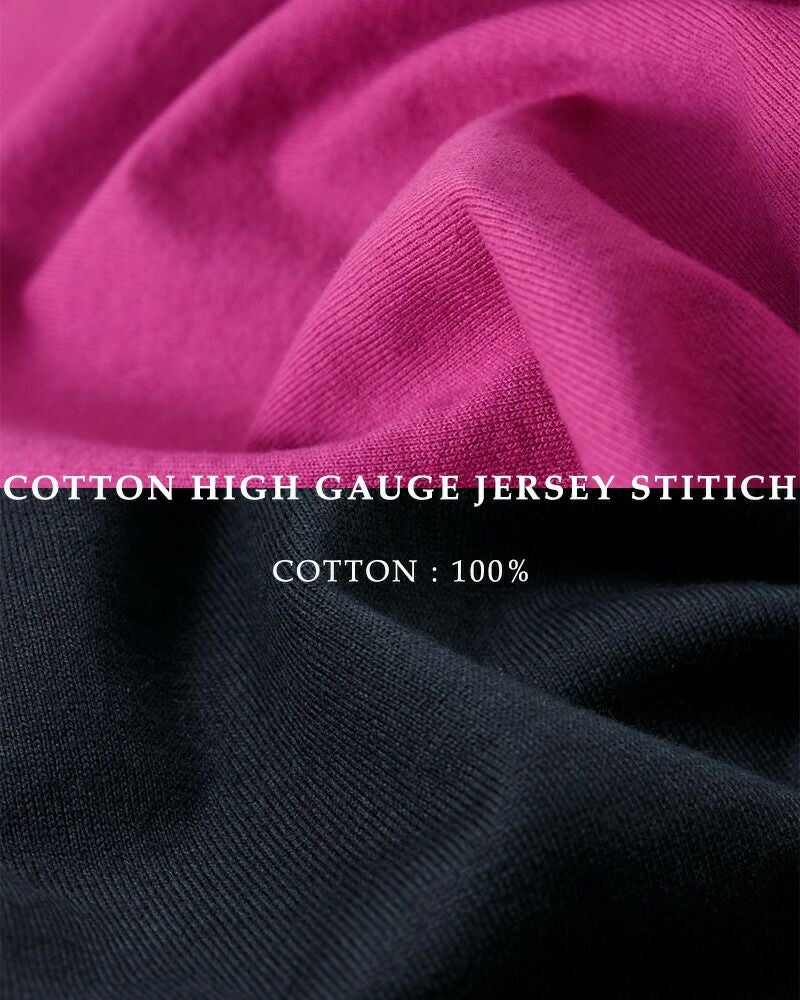 40/2の綿糸を使用し28ゲージで超高密度編立てした天竺素材です。 編み立て後シルケット加工を入れて艶感を一度出してから洗って膨らみを出しています。