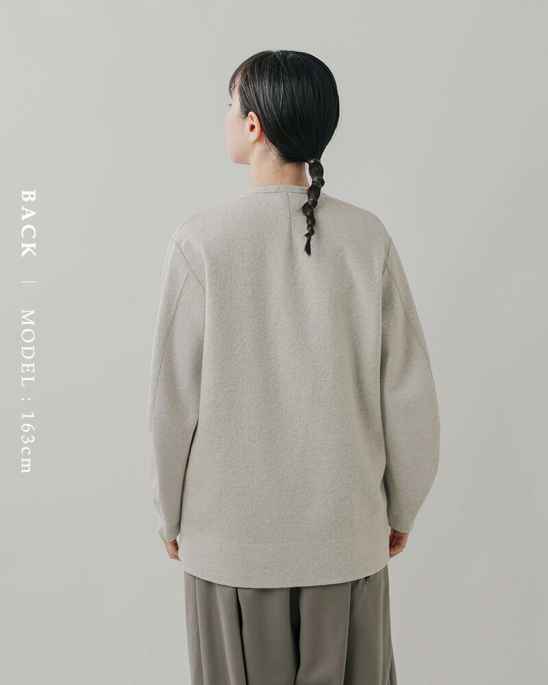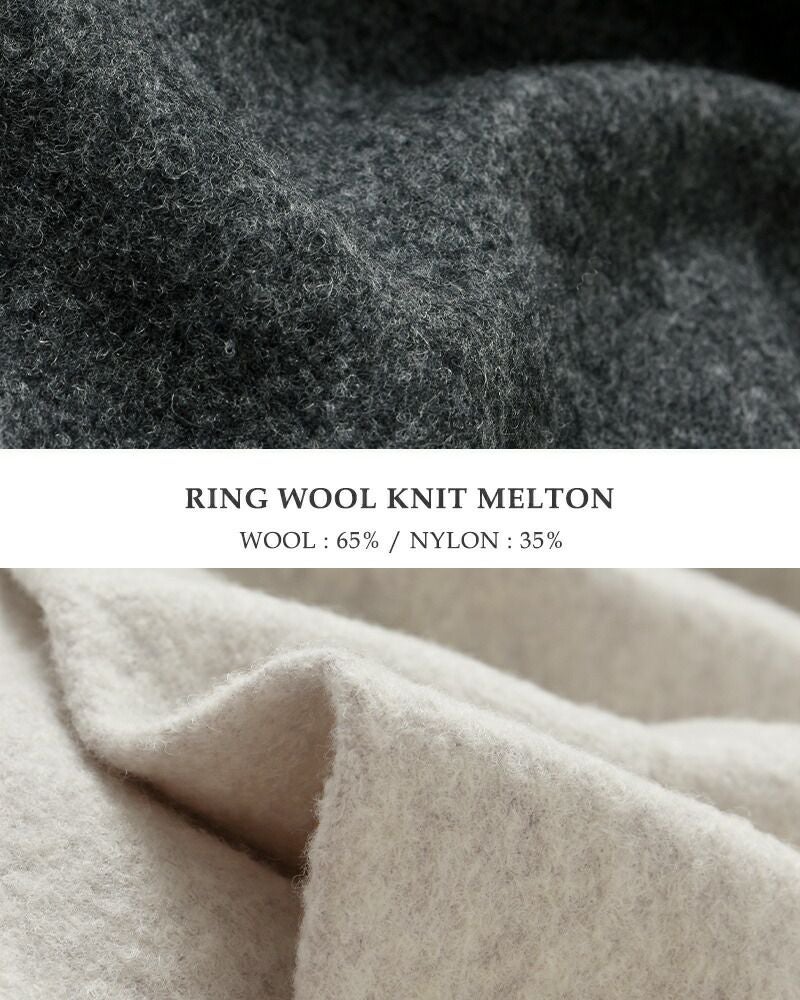 ファンシーヤーンであるリングウール糸で編んだ編み地を強力に縮絨しプレスしたニットで編んだメルトンのような生地。リングウール糸を縮絨しているため、通常の縮絨よりもしっかりとウールが絡み合い、ナイロン糸も入っていて高温高圧でしっかりと加工しているためとても強い生地となっています。滑らかな生地から浮かぶほのかな光沢感が上品な印象です。厚みを抑えた生地感なので、初秋のトップスとしても、冬のコートのインとしても活躍します。
