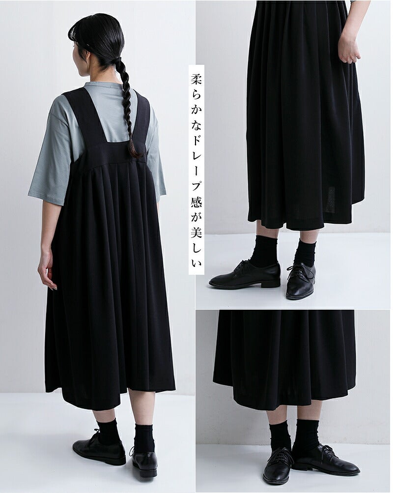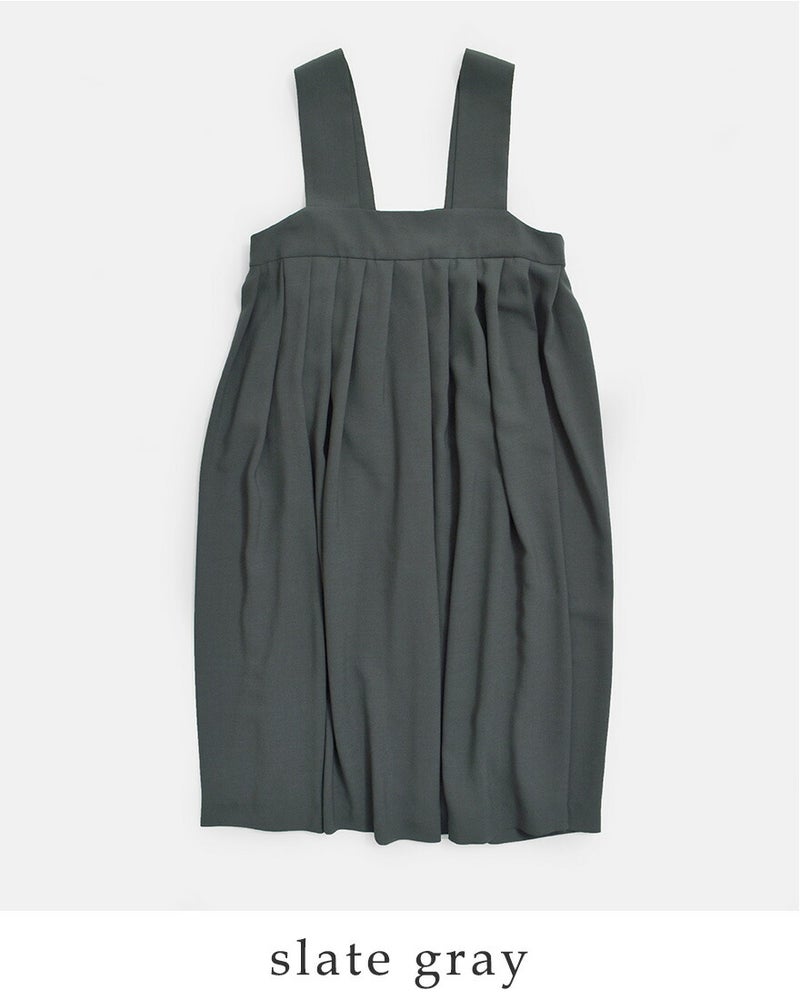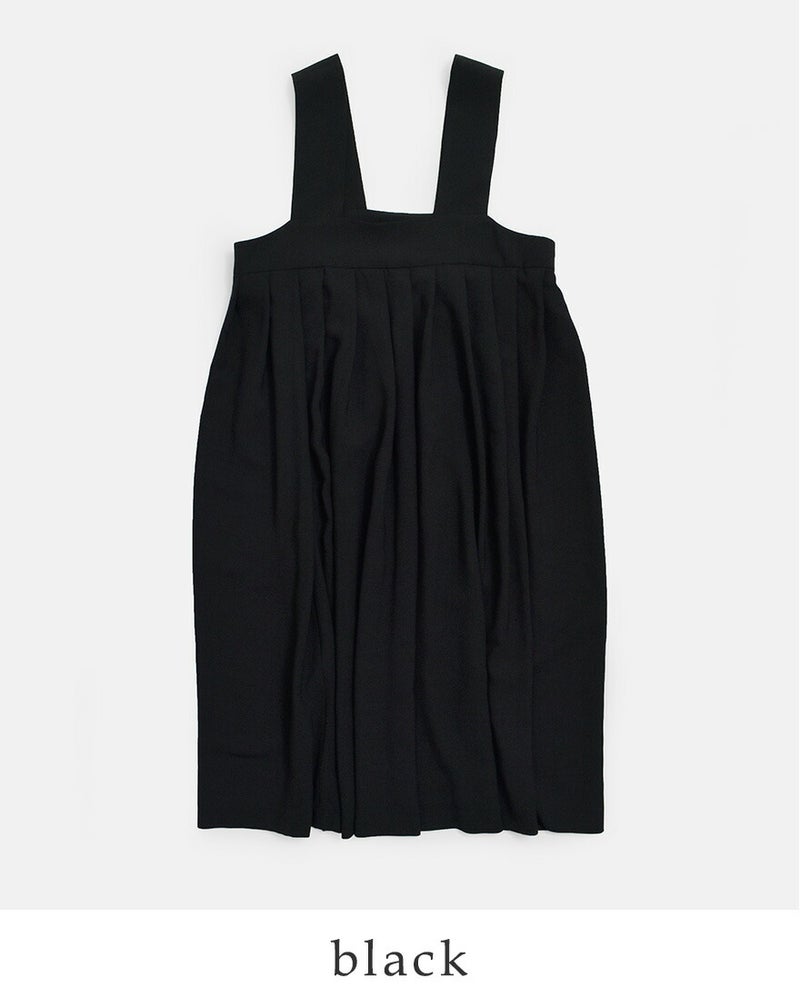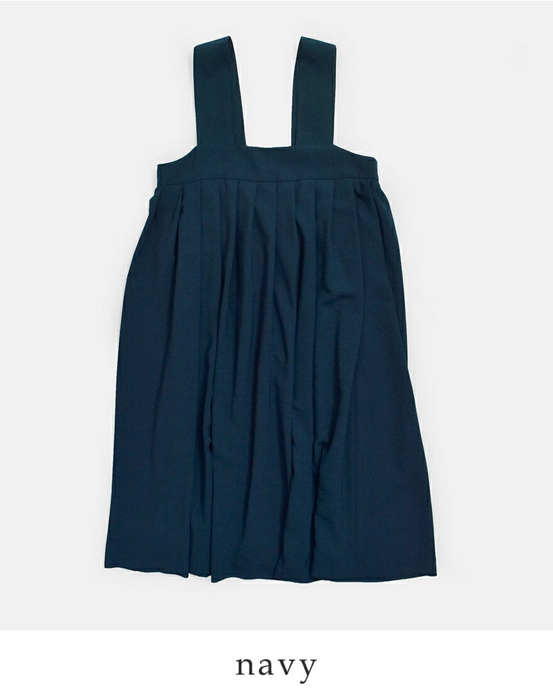 太めに設定された肩紐が独特のバランス感の一着。腰回りにたくさんのプリーツをデザインした生地分量の多いジャンパースカート。トップスを大きく見せるデザイン。