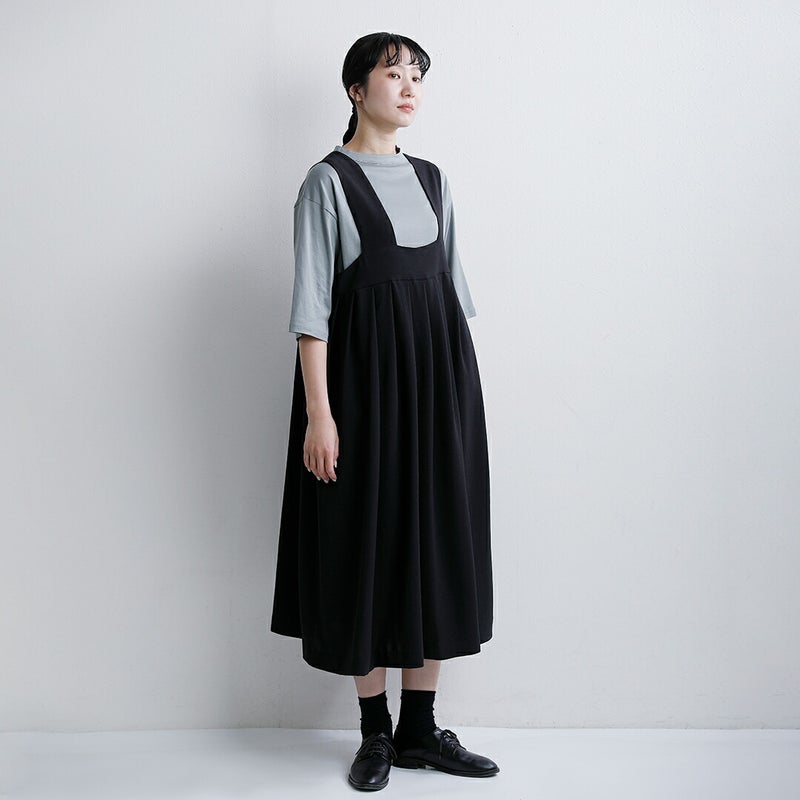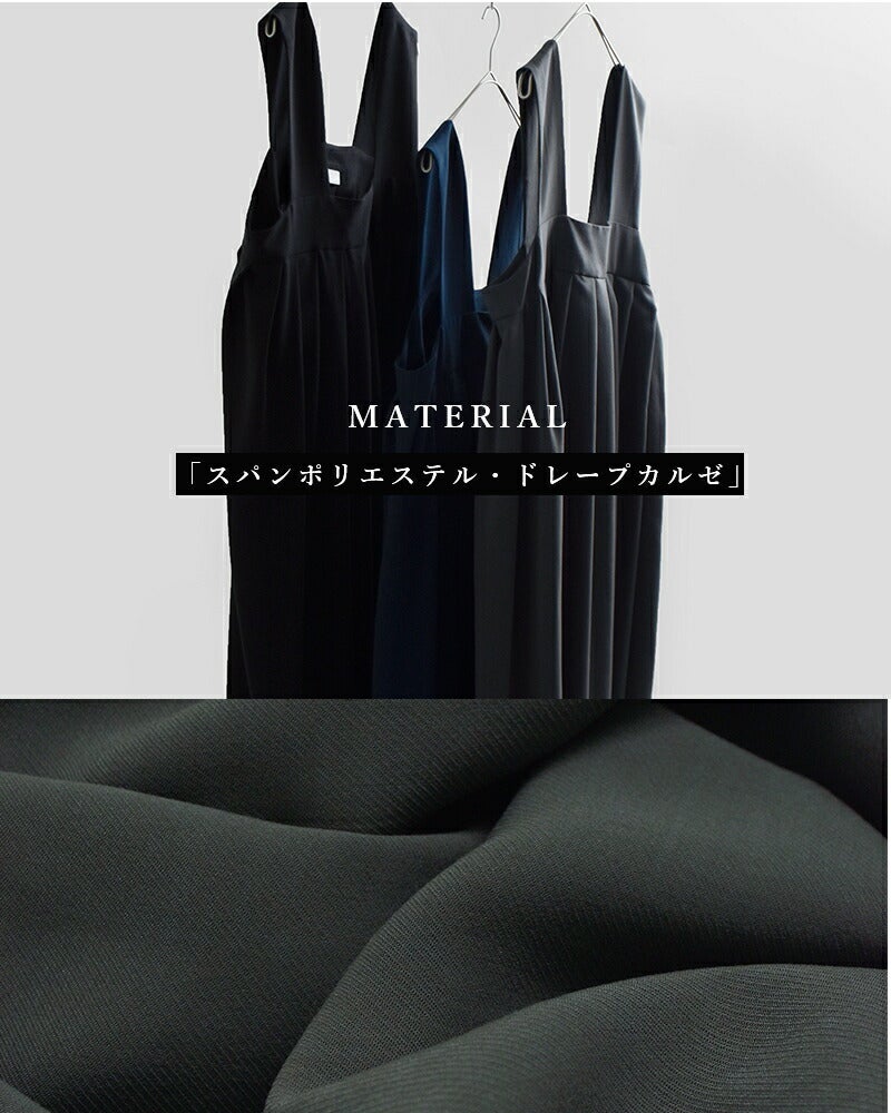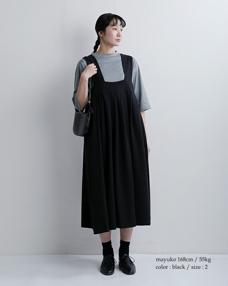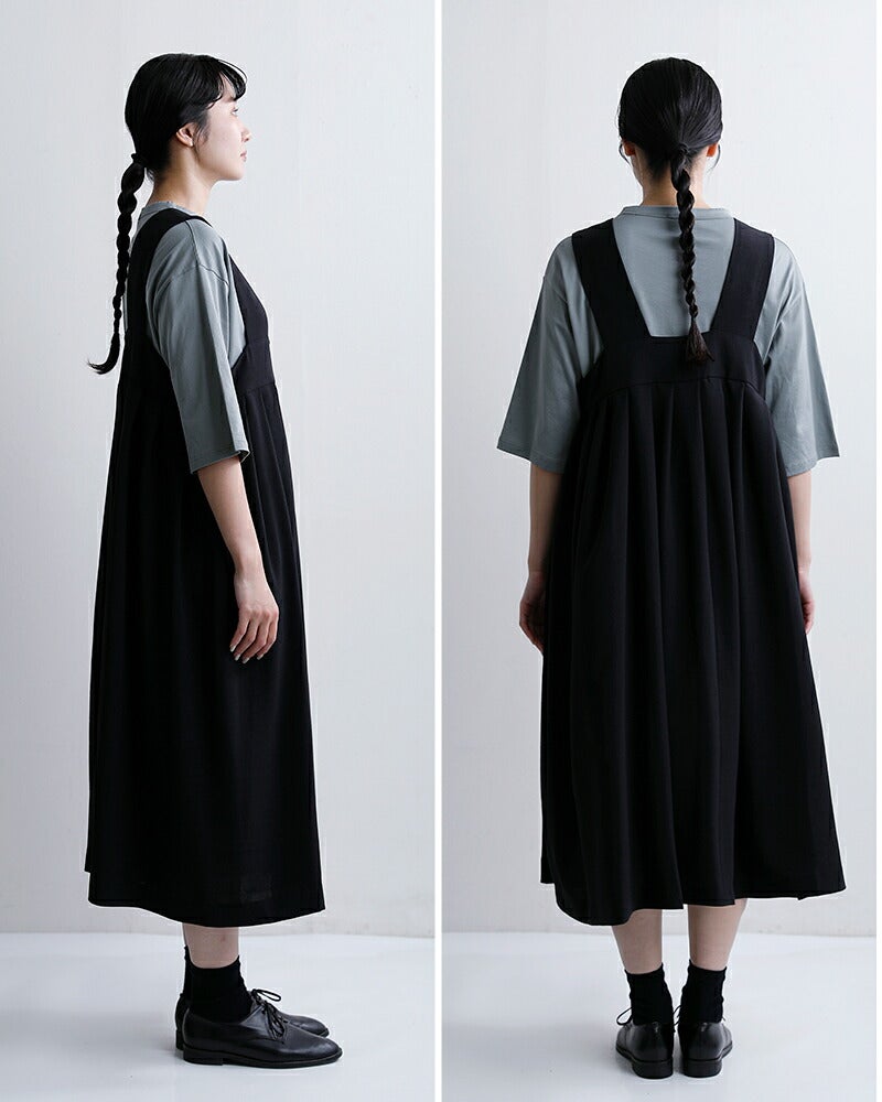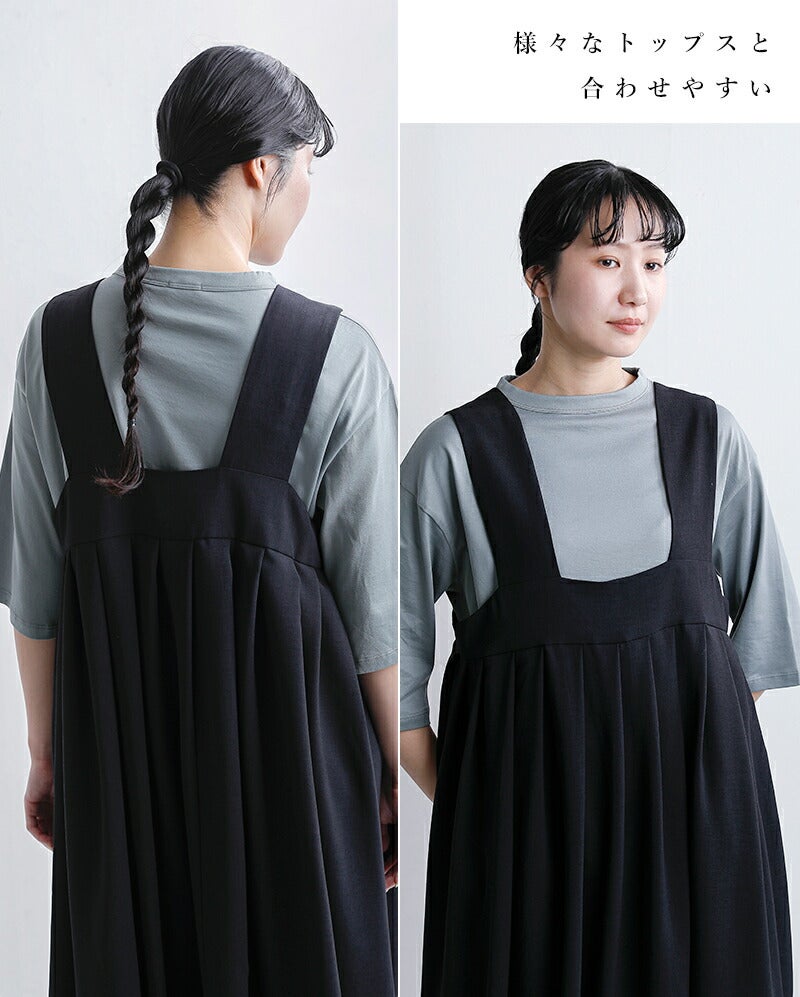 太めに設定された肩紐が独特のバランス感の一着。腰回りにたくさんのプリーツをデザインした生地分量の多いジャンパースカート。トップスを大きく見せるデザイン。