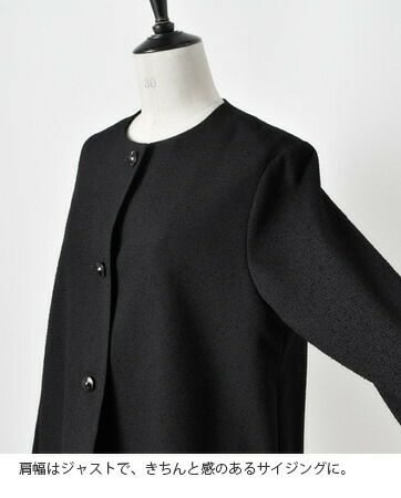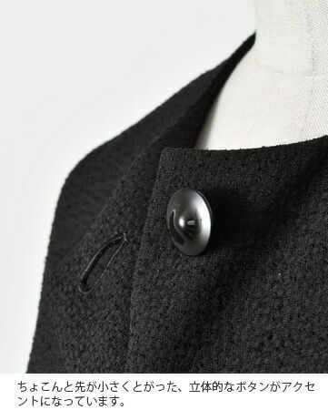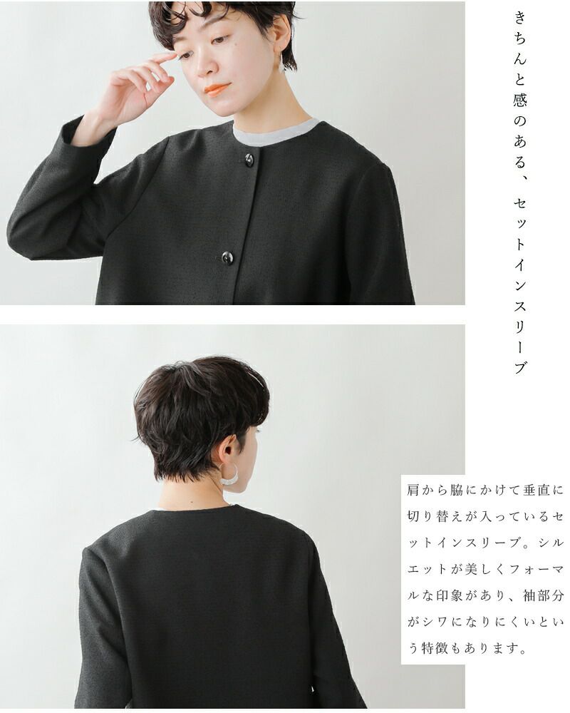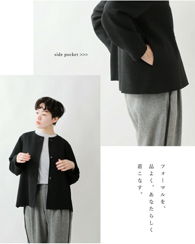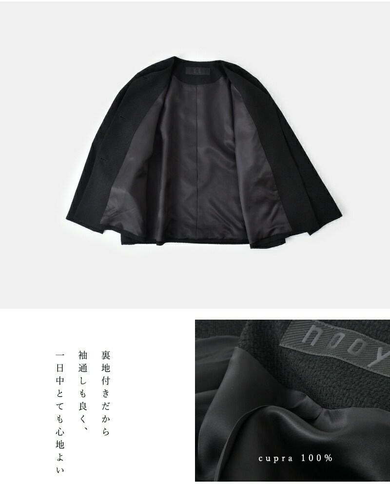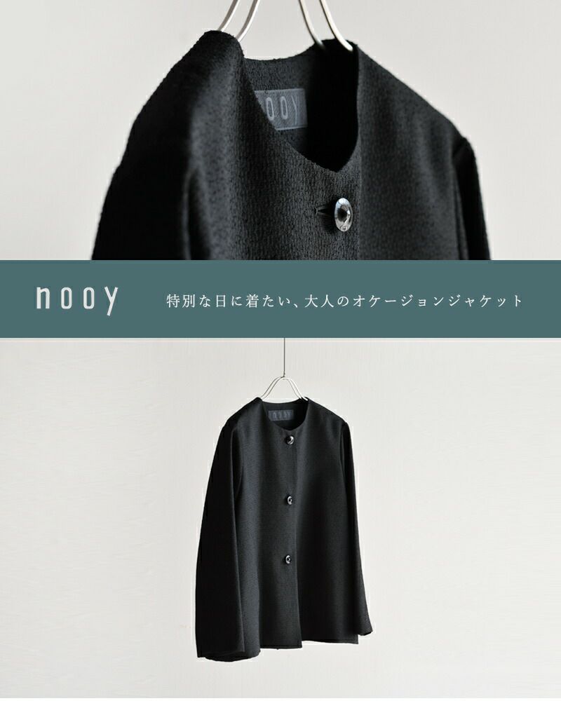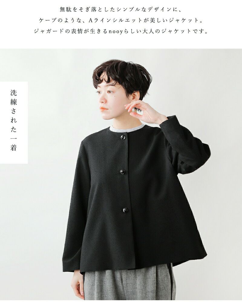 nooy(ヌーイ)より、ブークレジャガードブラックノーカラーケープジャケットのご紹介です。細やかな織り模様が美しいファブリックを使用し、フォーマルシーンを品良く個性的に演出するショート丈ジャケットです。軽い羽織心地とパールネックレスの似合うノーカラーがポイントで、ケープのように裾が広がるラインシルエットで、美しい佇まいが特徴。モードでありつつもクラシックな雰囲気が他ではなかなか見られないデザインとなっています。