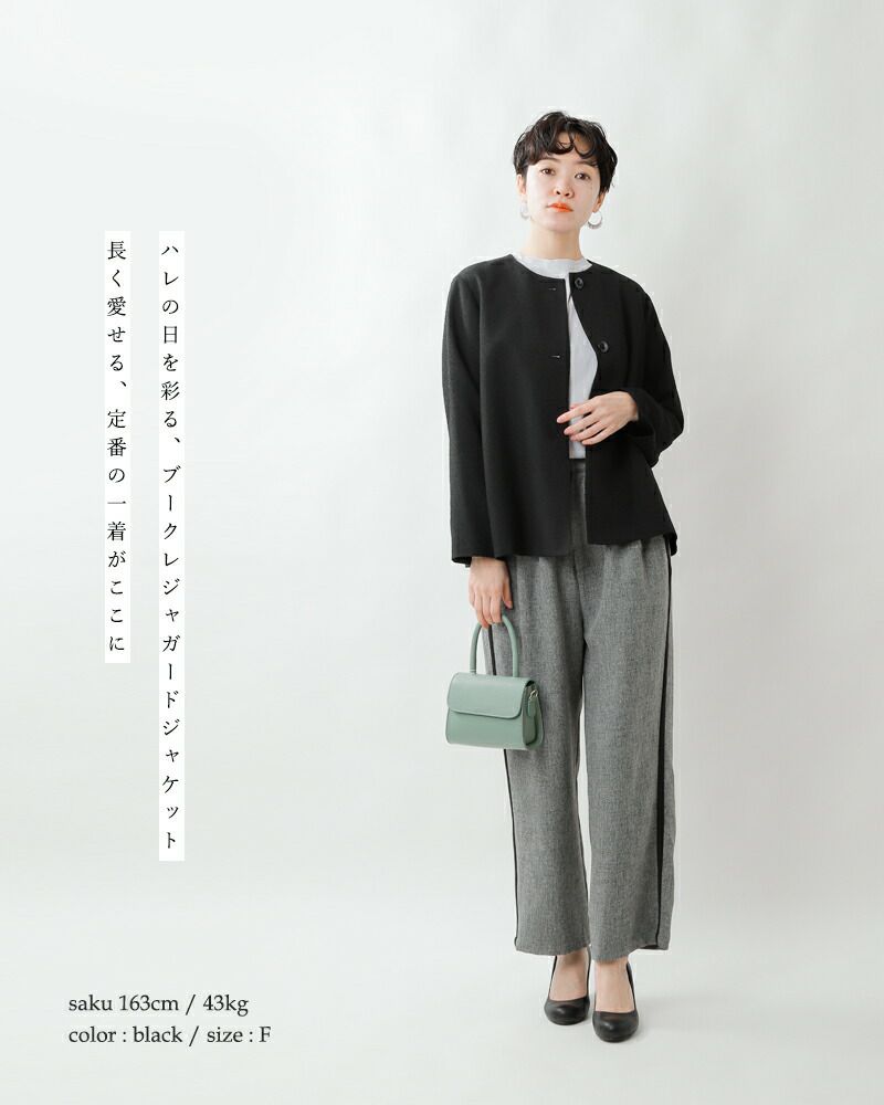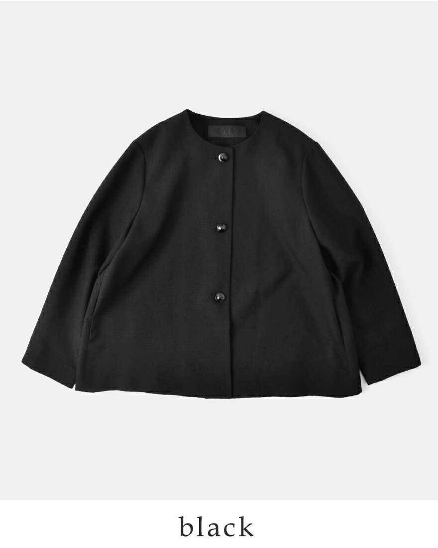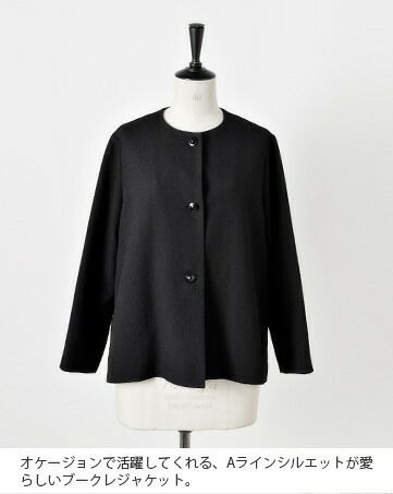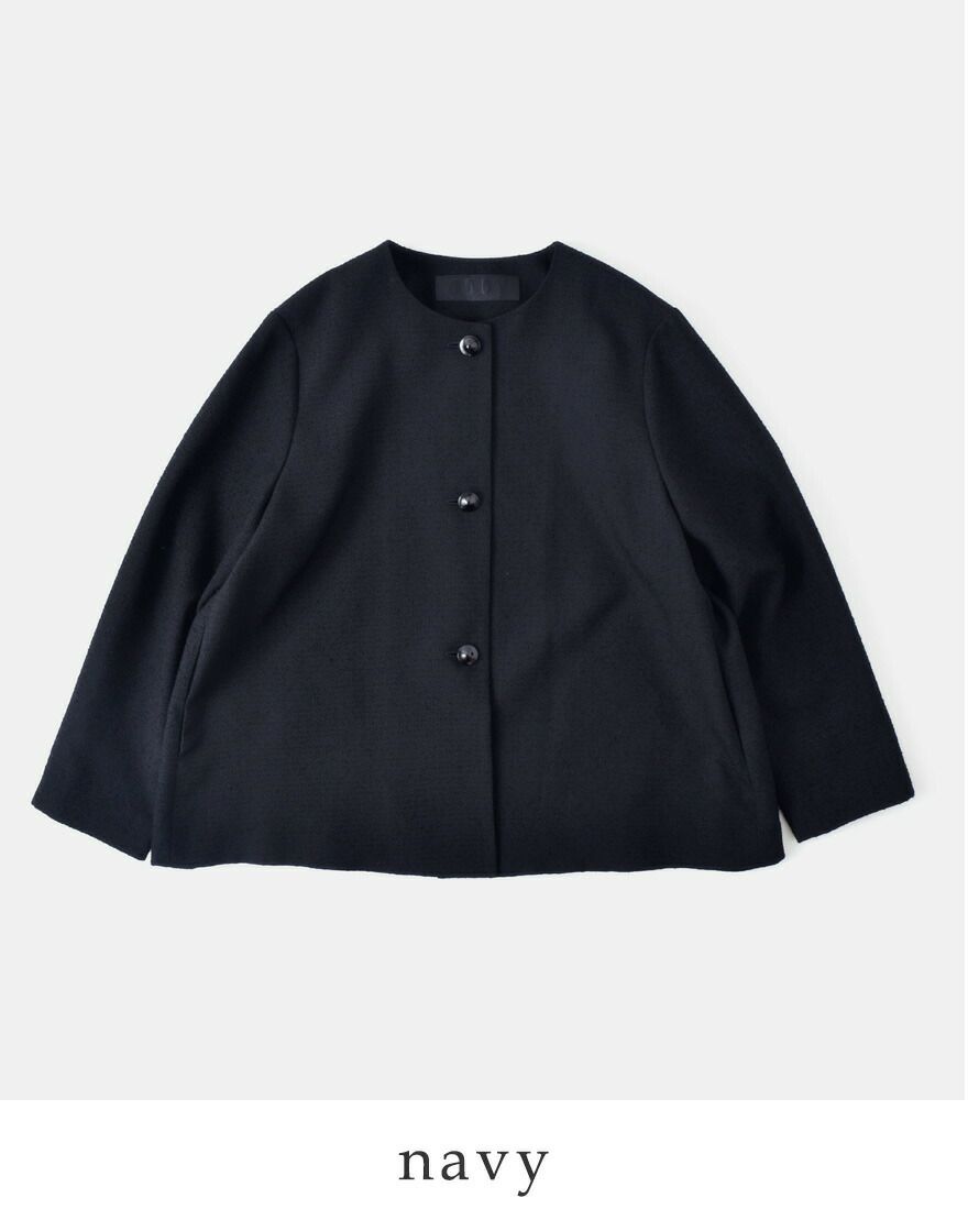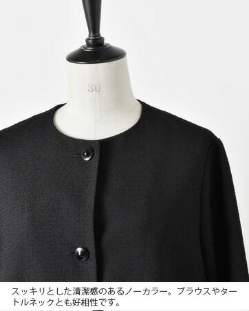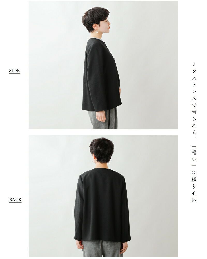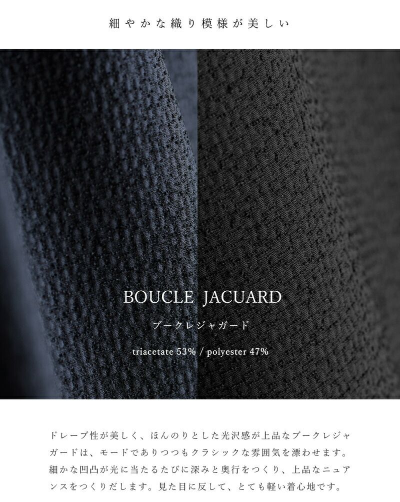 nooy(ヌーイ)より、ブークレジャガードブラックノーカラーケープジャケットのご紹介です。細やかな織り模様が美しいファブリックを使用し、フォーマルシーンを品良く個性的に演出するショート丈ジャケットです。軽い羽織心地とパールネックレスの似合うノーカラーがポイントで、ケープのように裾が広がるラインシルエットで、美しい佇まいが特徴。モードでありつつもクラシックな雰囲気が他ではなかなか見られないデザインとなっています。