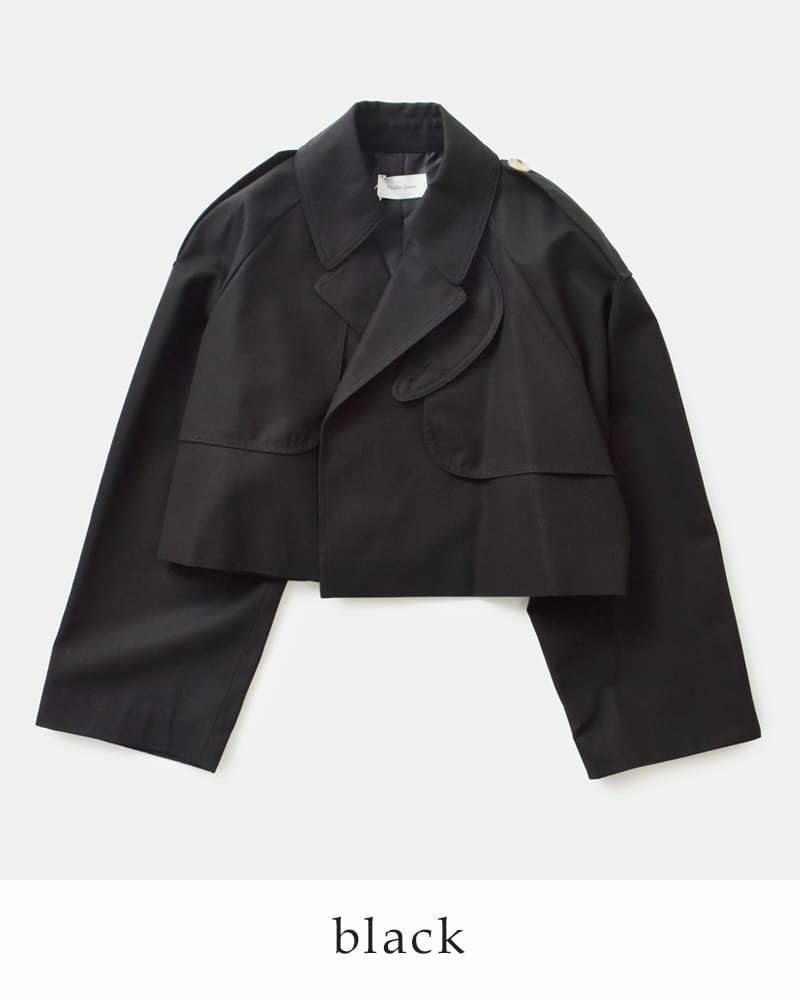 トレンチコートのディテールを落とし込んだボタンレスのショートジャケット。 ボリュームのあるラグランスリーブが特徴で、羽織として様々なスタイリングに使える一枚。ハリ・コシのある強撚コットンを使用しているため、ボリューム感のあるデザインでもシルエットが崩れにくく綺麗に着用できます。シーズンレスで使える素材感とデザインで様々なスタイリングに取り入れやすいアイテムです。総裏仕立て・チンストラップ付。