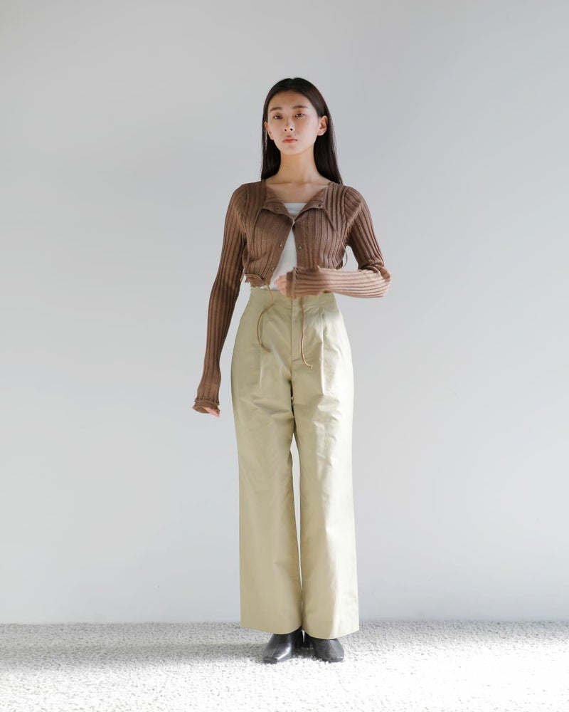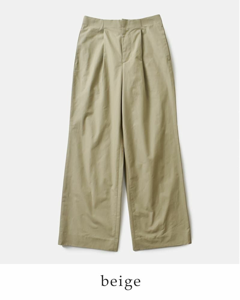 フロントにツータックを配置し、緩やかな膨らみを表現。ウエストボタンのないフロントデザインで、ミニマルでスタイリッシュな印象です。