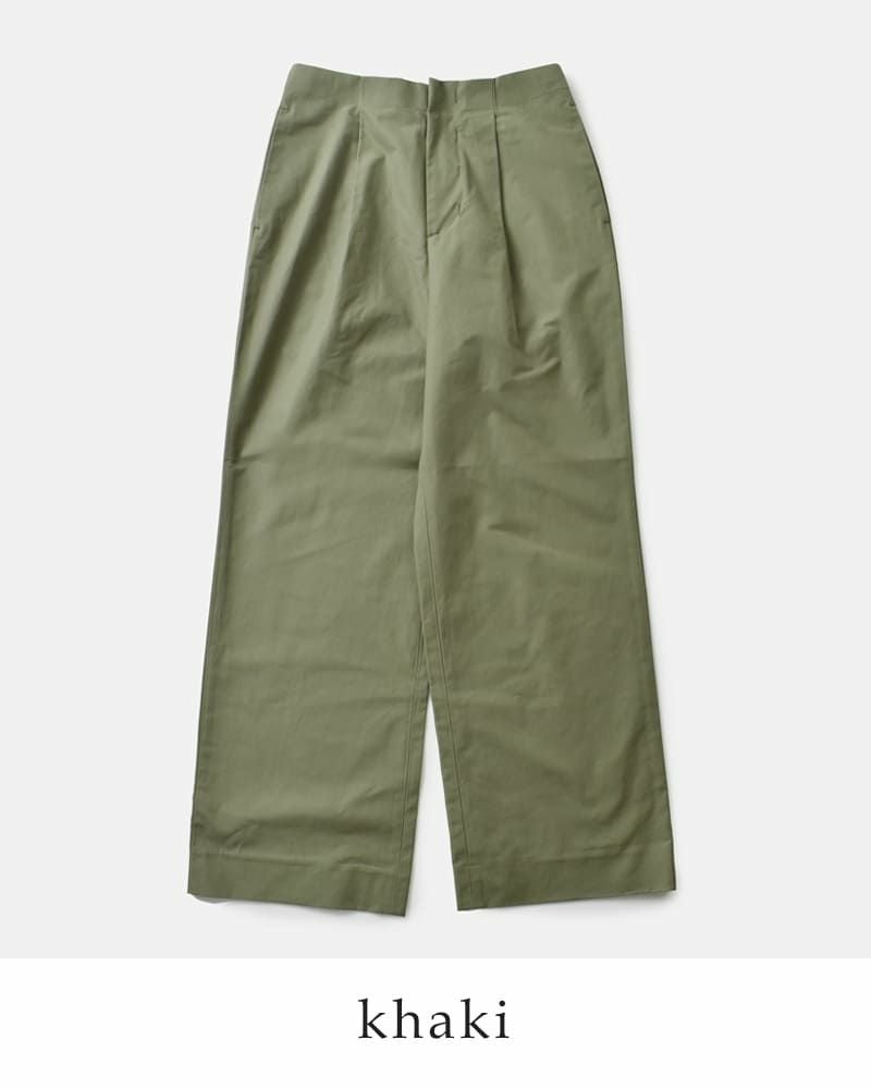 程よくワイドなストレートシルエットが美しいチノスラックス。腰位置が高めの設定で、脚を長く綺麗に見せます。