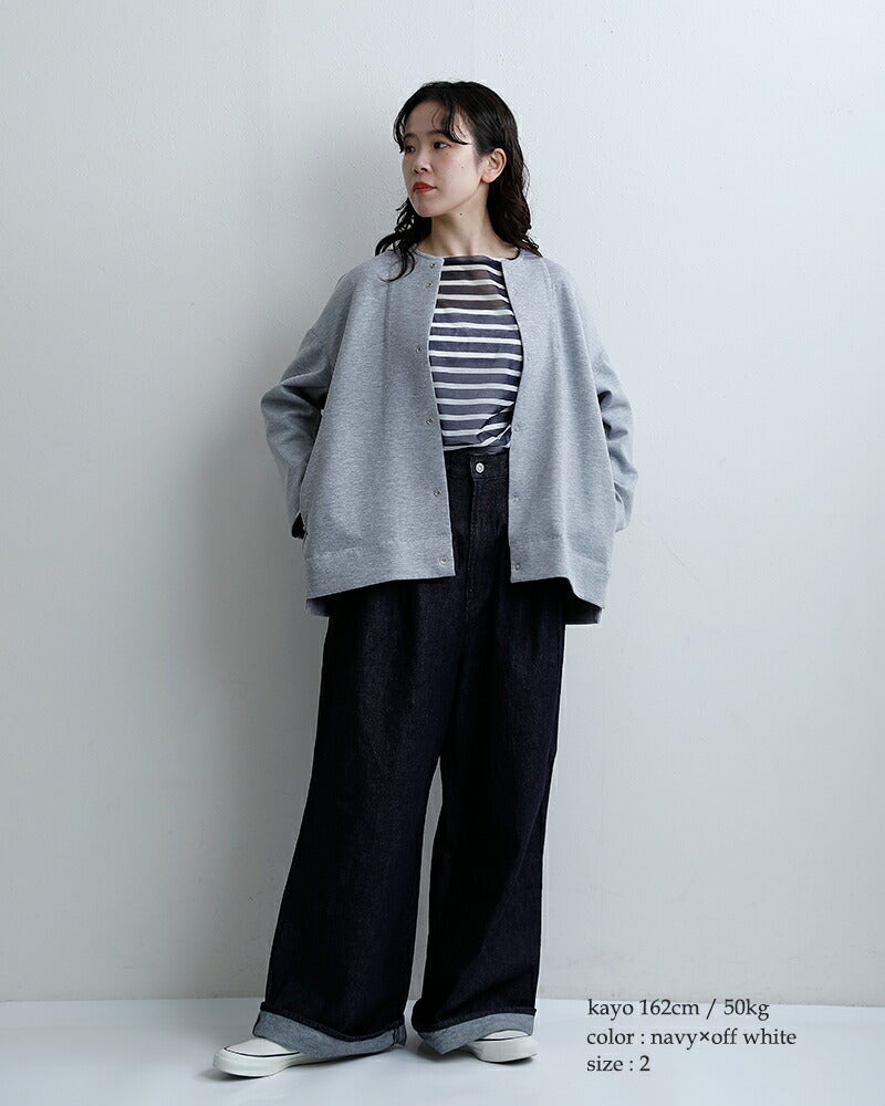 首元をすっきり見せてくれるボートネック。程よい丈感なので、タックインもアウトも自由自在。