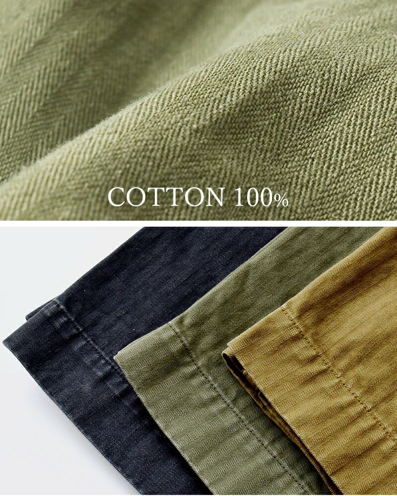 コットン100%のヘリンボーンツイル生地は、穿きこむほどに味わいが増し、経年変化も楽しめます。