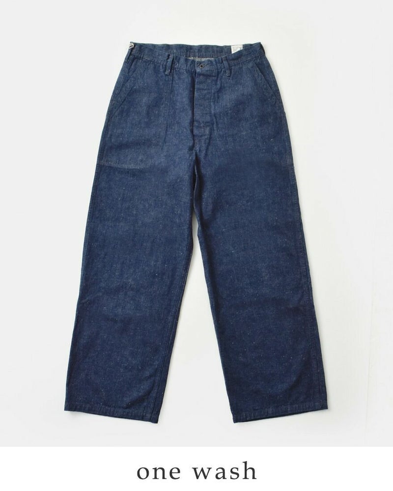 or slow(オアスロウ)より、ワイドフィットUSネイビーデニムユーティリティパンツのご紹介です。1940年代の第二次世界大戦中に実在した作業用のデニムパンツよりインスピレーションを受けたデニムパンツ。オリジナルの9oz selvedge deniを使用。ブランド発足最初期の頃にリリースされた、orSlowのアイコン的アイテムの一つでもある一本です。通常のデニムより薄手の柔らかい生地感に、シンプルな4ポケタイプのデザインはシーズンレスで穿きまわしたくなります。