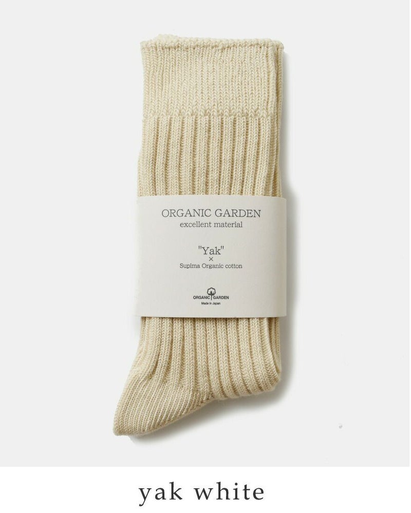 ORGANIC GARDEN(オーガニックガーデン)より、スーピマ綿×ヤク ローゲージリブソックスをご紹介します。チベットなどアジアの標高4000mを超える高地に生息する「ヤク」の毛としなやかな「スーピマオーガニックコットン」の混紡糸で編み上げたリブソックスです。どんなスタイルにも合わせやすく、ヤクシリーズの中でも定番の一足です。非常に保温性が高く、やさしくしっとりとした肌触りが特徴。ざっくりとローゲージで編みたてた肉厚なリブソックスが足をしっかりと暖めてくれます。サイズは22.5~24.5cmと、25~27cmをご用意。ユニセックスデザインで、男女問わず穿いていただけます。オリジナルのパッケージも素敵で、プレゼントにも喜ばれるお品物です。